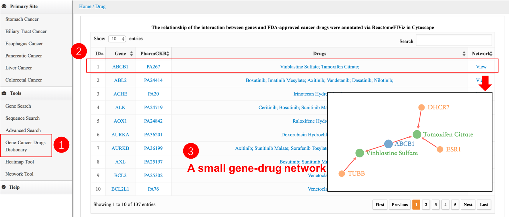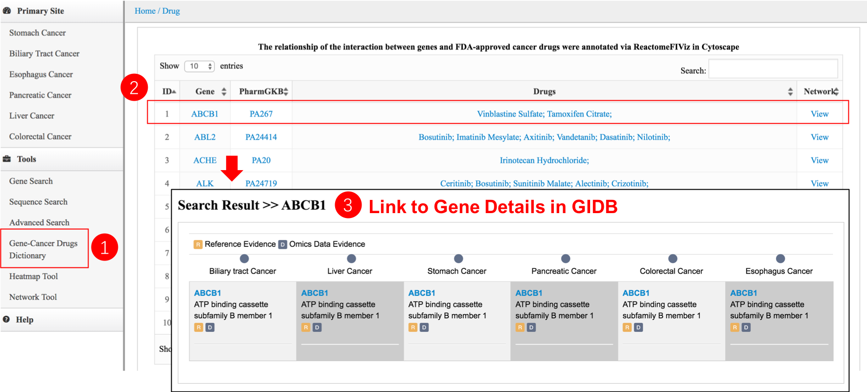 The GIDB integrates information about curated gene sets and anticancer drugs approved by the US Food and Drug Administration (FDA) using ReactomeFIViz. There are two types of links that can be used in the Gene-Cancer Drugs Dictionary page. Firstly, a gene is linked to the Gene Search Result page where you can find the detail of its relationship to GI cancer.