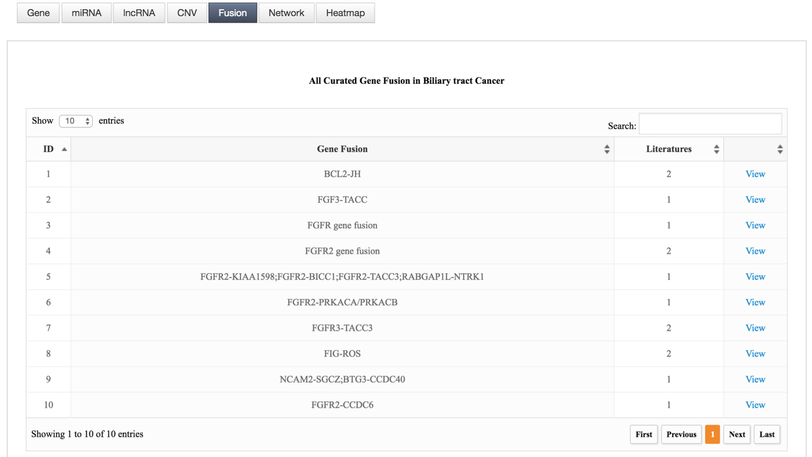 The lists of Fusion have been annotated with Gene fusions (eg, FGF3-TACC) and literature counts in Pubmed. Click "View" button, the detailed information of these literatures can be displayed.
