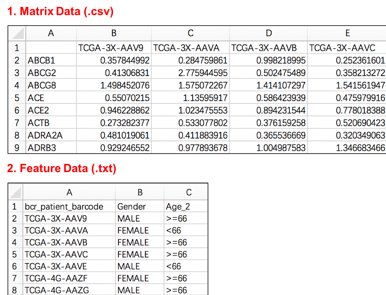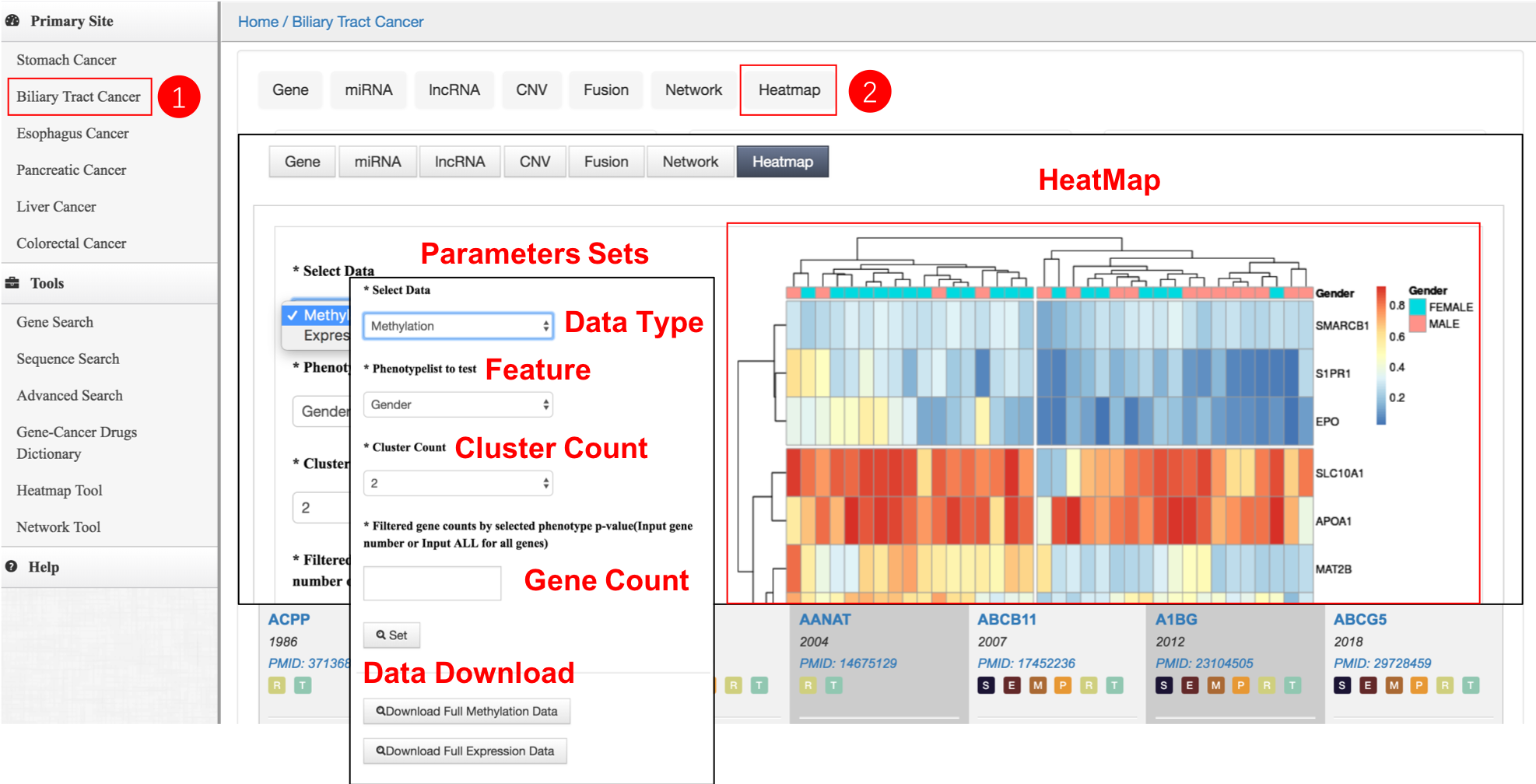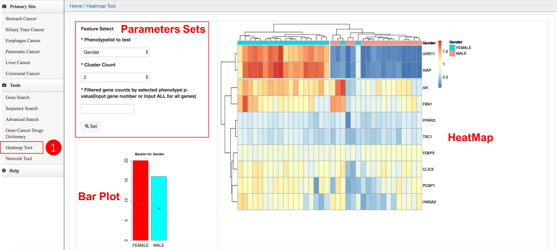 Moreover, GIDB provides a Heatmap tool (the left side navigation) to upload user's own dataset to identify tumor subgroups features. In current version of GIDB, it only supports two characteristics for classification: Gender and Age (two group).