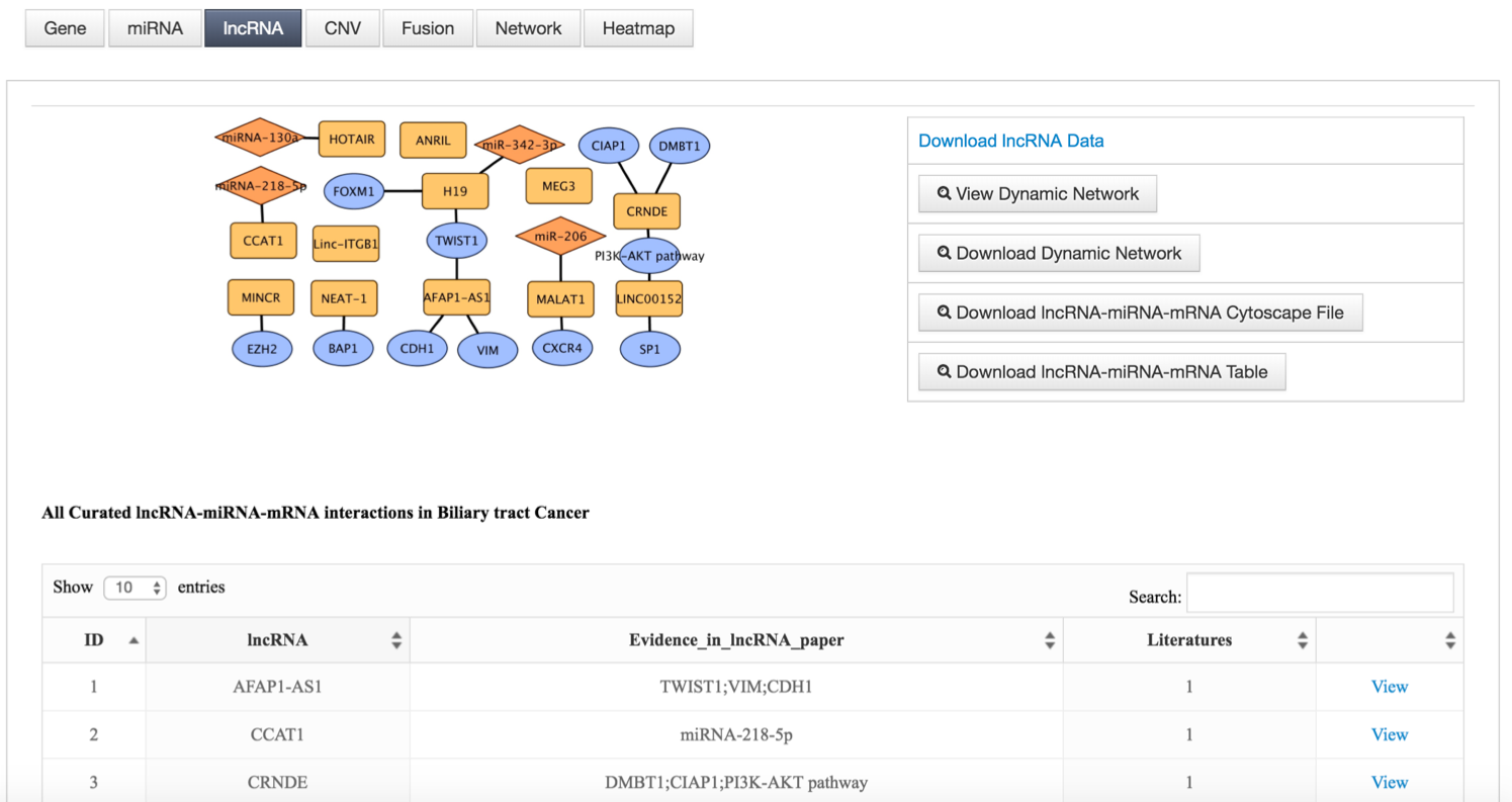 The GIDB also consists of curated signatures on miRNAs-target, lncRNAs, fusion genes and CNVs. For miRNAs and lncRNAs, GIDB provides a network 2D visualization, a network 3D visualization and datasets (dynamic network files, cytoscape network format files, genes /miRNAs/lncRNAs tables) for download. Considering a good visualization, nodes will not be shown in a network if the interaction degrees are low in some cancers.