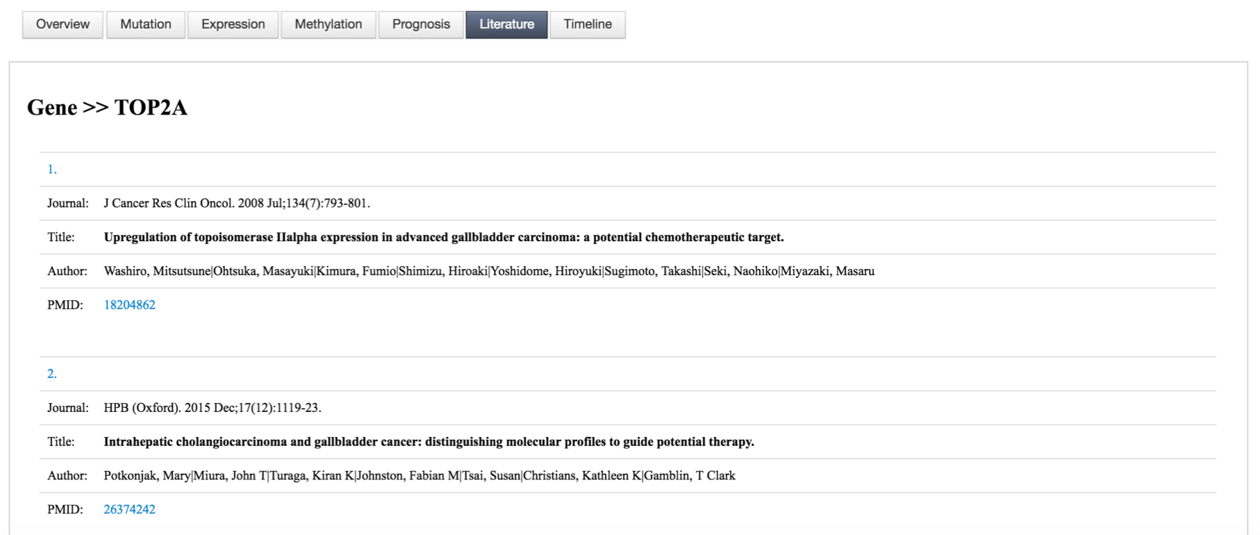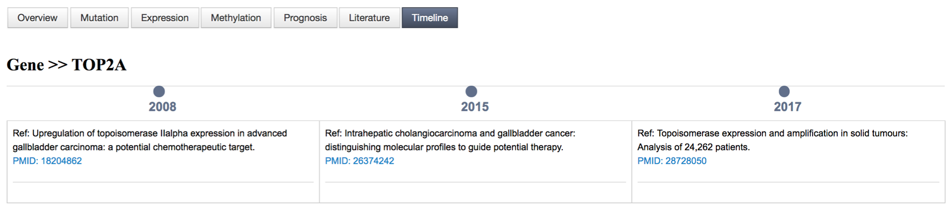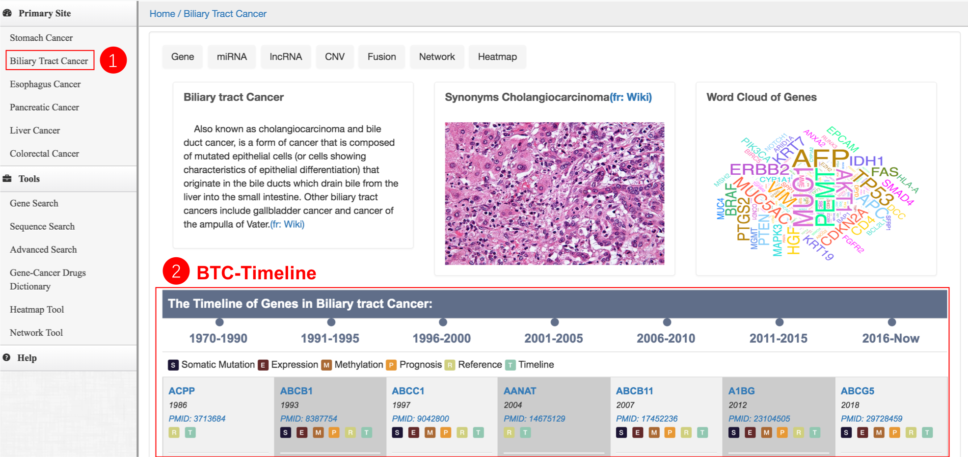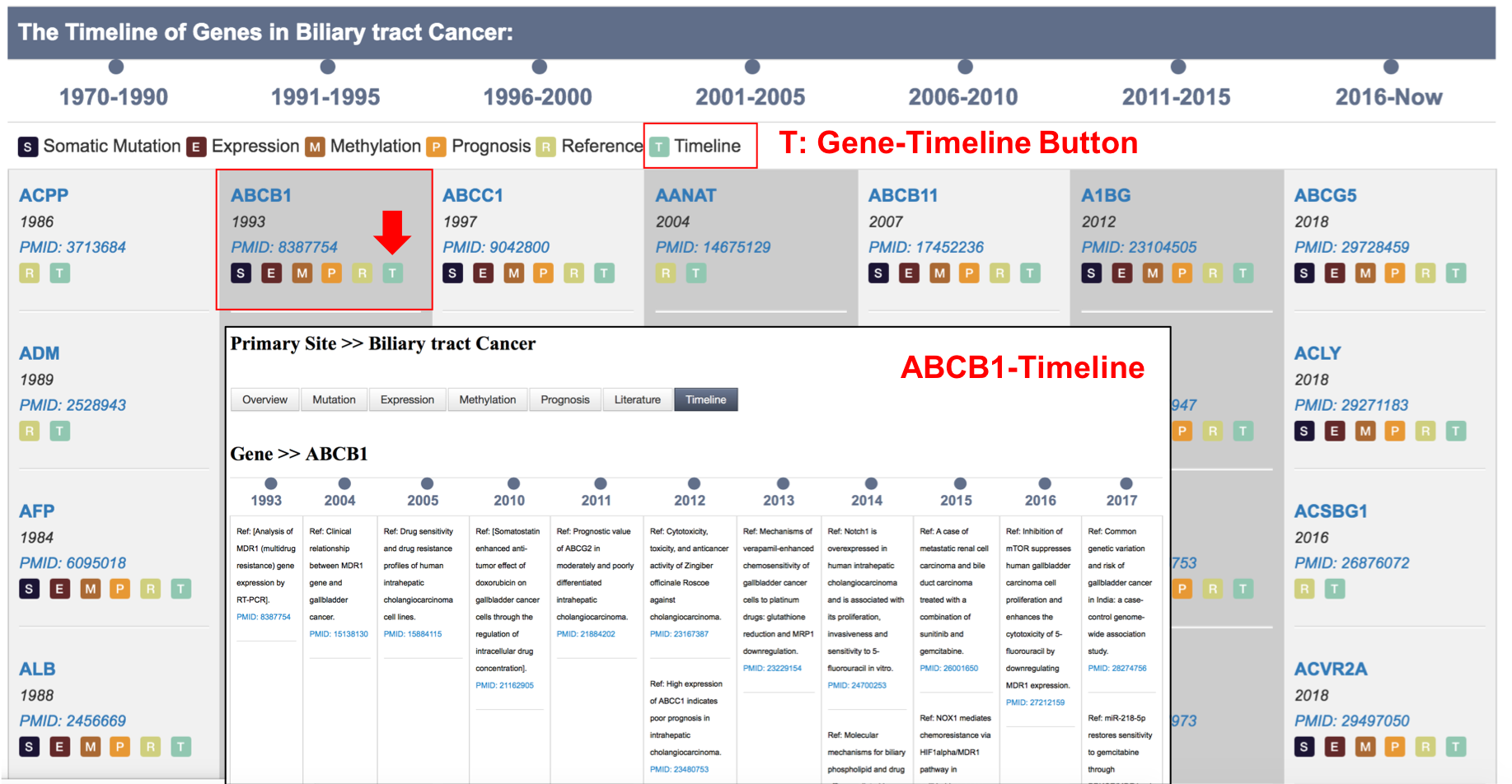 In GIDB, there are two kinds of timeline features, Cancer-Timeline and Gene-Timeline. We take Biliary Tract Cancer (BTC) as an example.