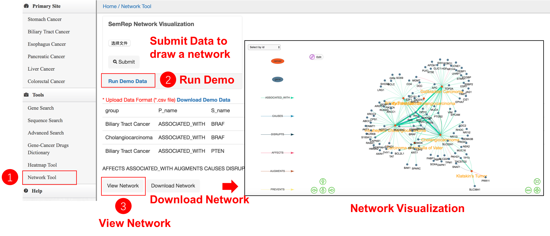 The semantic associations of entities in text are identified by SemRep in the form of a semantic knowledge network. The GIDB currently accommodates semantic relations on AFFECTS, ASSOCIATED_WITH, AUGMENTS, CAUSES, DISRUPTS, PREVENTS and TREATS. One can view how genes (nodes) interact (edges) in each GI cancer type (nodes) in a 2D/3D network mode. Click "Network " button of each primary site, the details of Gene-Cancer Semantic Network also have been showed in the table below. Click "View Dynamic Network " button, the dynamic Network can be displayed.
