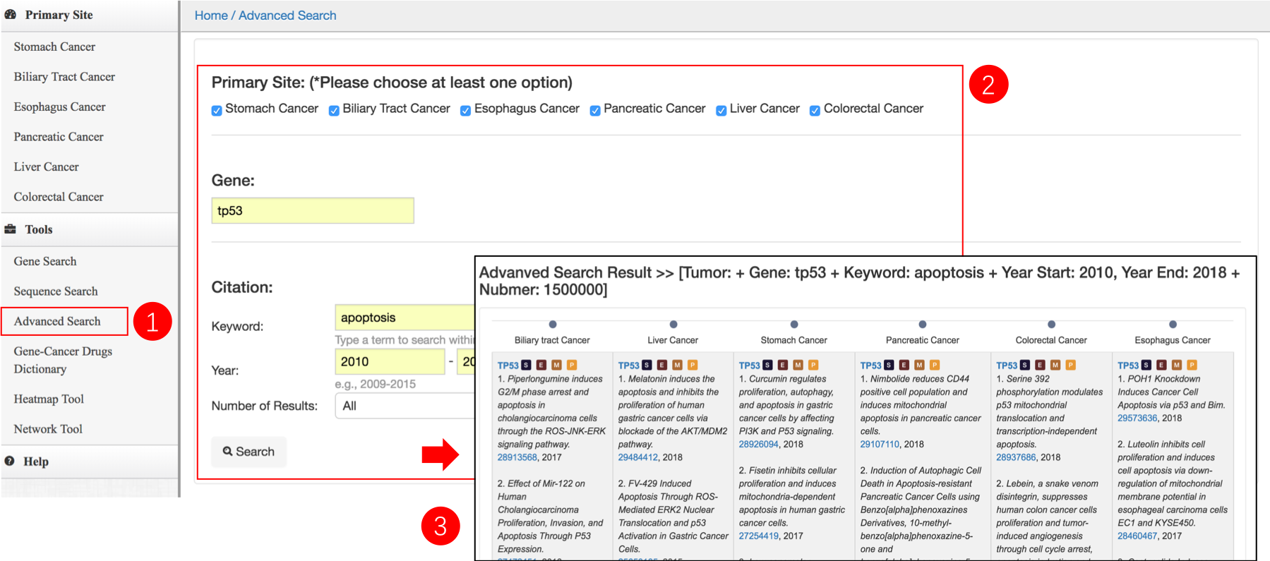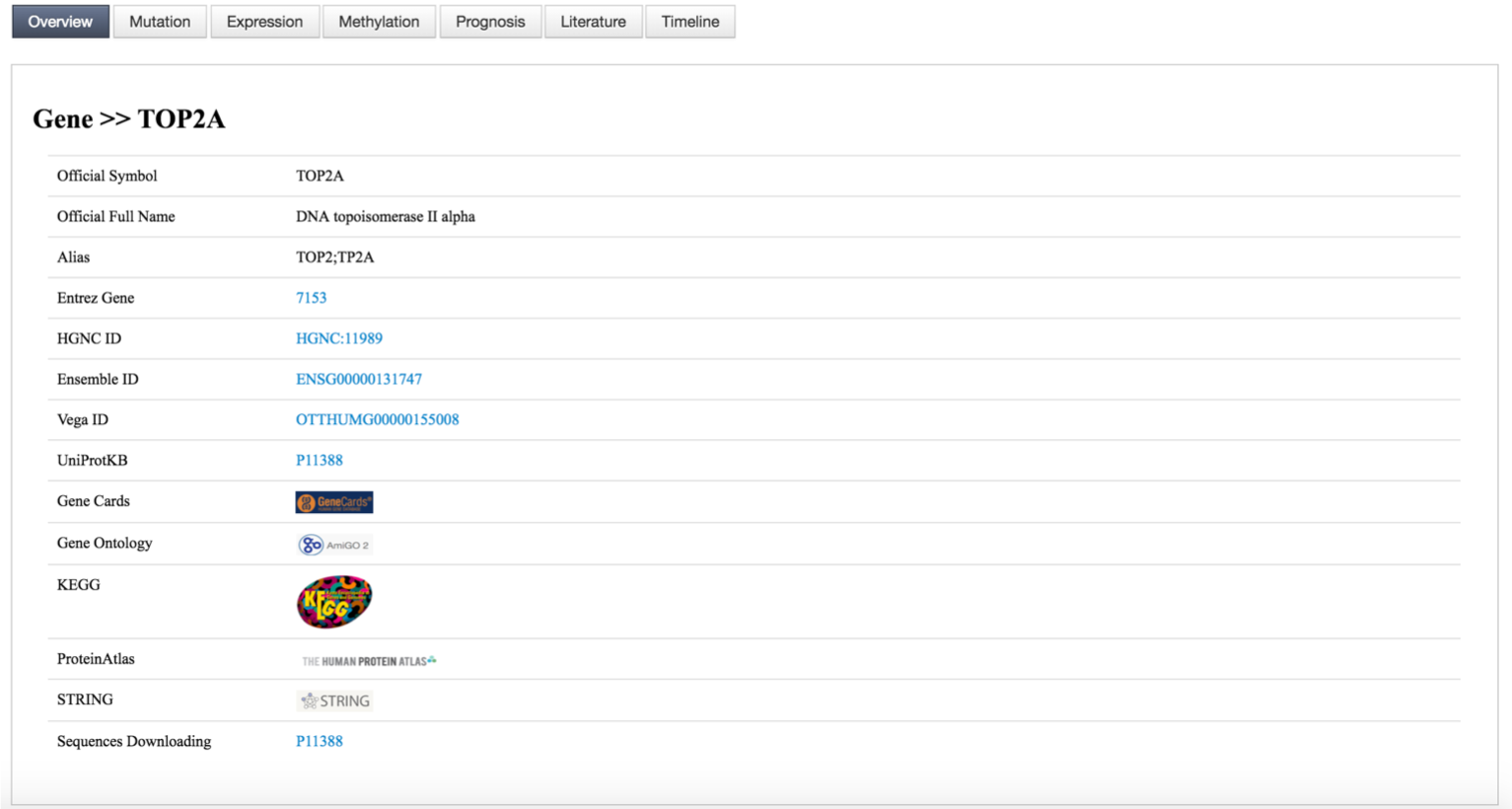 The Gene-Timeline is an interactive and data-rich resource that provides a historical overview of studies in each gene associated with each type of GI cancer. A span of 40 years from the 1970s to the last update time in this version of the GIDB in 2018.11 is chronicled in the Timeline.
