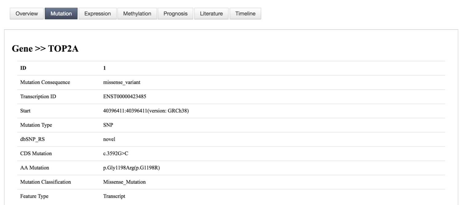 The table shows a list of mutation information for each curated gene. It describes Mutation Consequence, Transcription ID, Start, Mutation Type, dbSNP_RS, CDS Mutation, AA Mutation, Mutation Classification and Feature Type. For more details on data source please see "Data Source and Data Type"