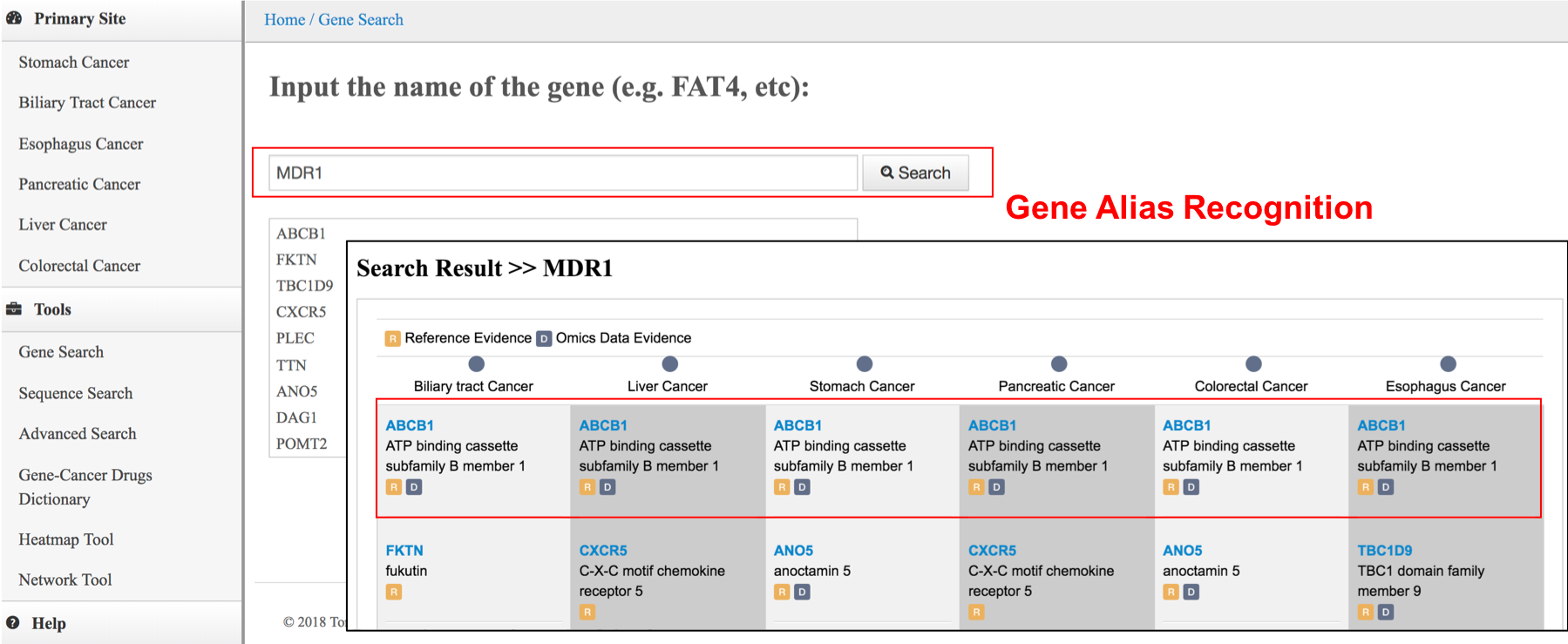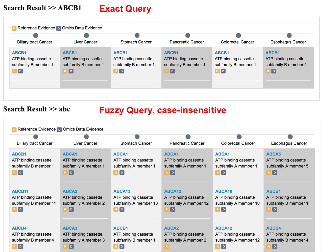 In GIDB, the search term is case-insensitive, as shown in the following figures. Moreover, if the query string is part of official gene symbols or full/part of alias of a gene, both of which use fuzzy matching.