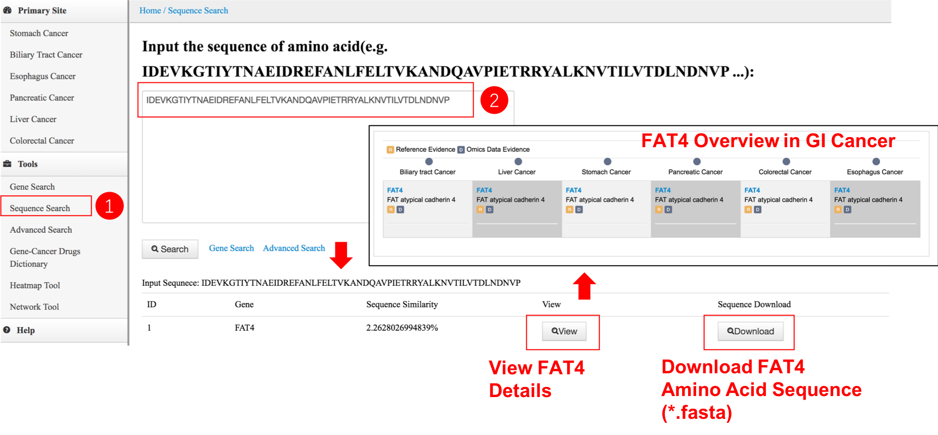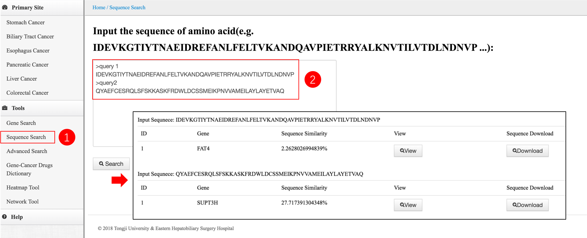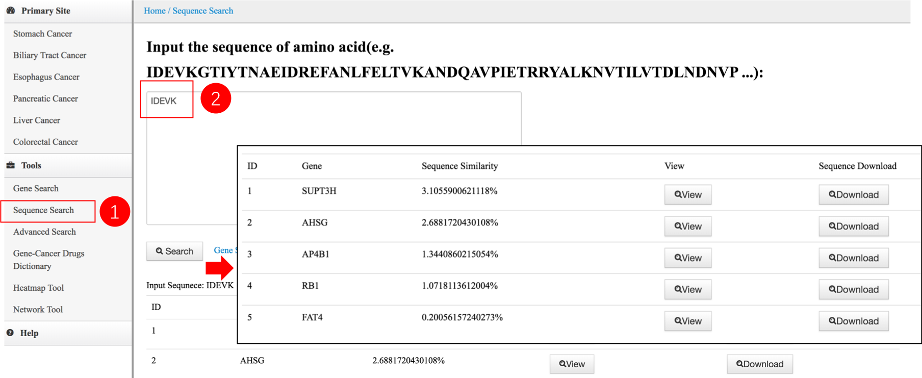 In GIDB, the amino acid sequence of the search result is available for download. Moreover, query sequences will return lists as their result in a descending order by the sequence similarity. We used the similar_text function in PHP to measure the similarity between one input sequence and all FASTA-formatted amino acid sequences of GI cancer related proteins stored in the database. In total, there are two possibilities for the sequence search:1. Sequences to be exact matches