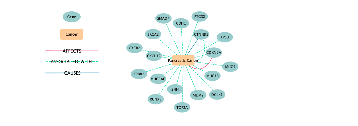 | 18 | CDKN2A | Pancreatic Cancer | CAUSES | 3 |