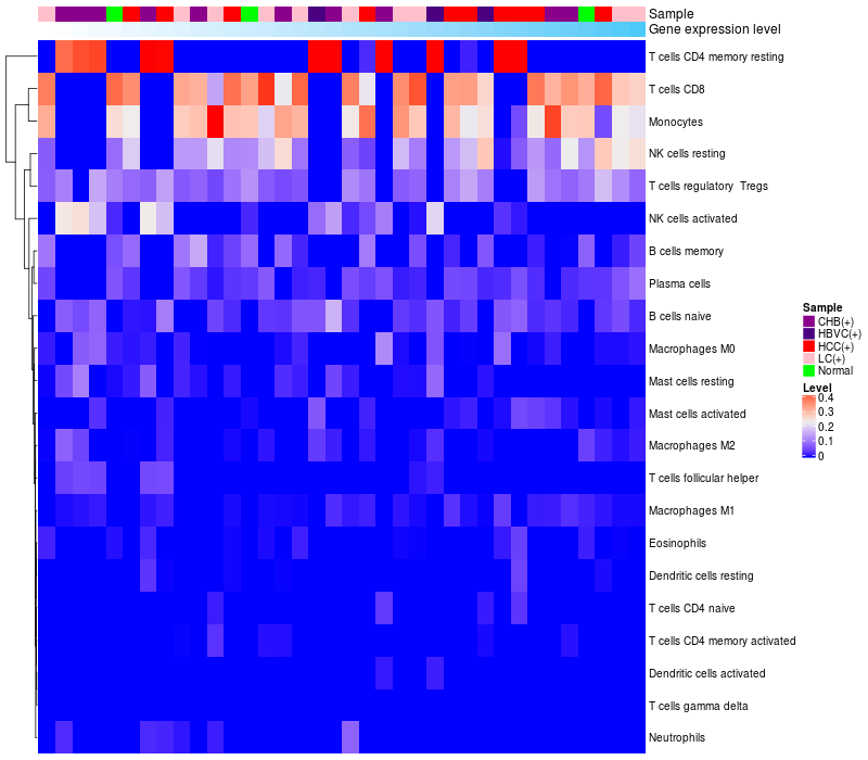 Chronic hepatitis B patients (HBV+)(10),Hepatocellular carcinoma (HBV+)(10),Liver cirrhosis(HBV+)(10),Normal(3),HBV carriers (3) |