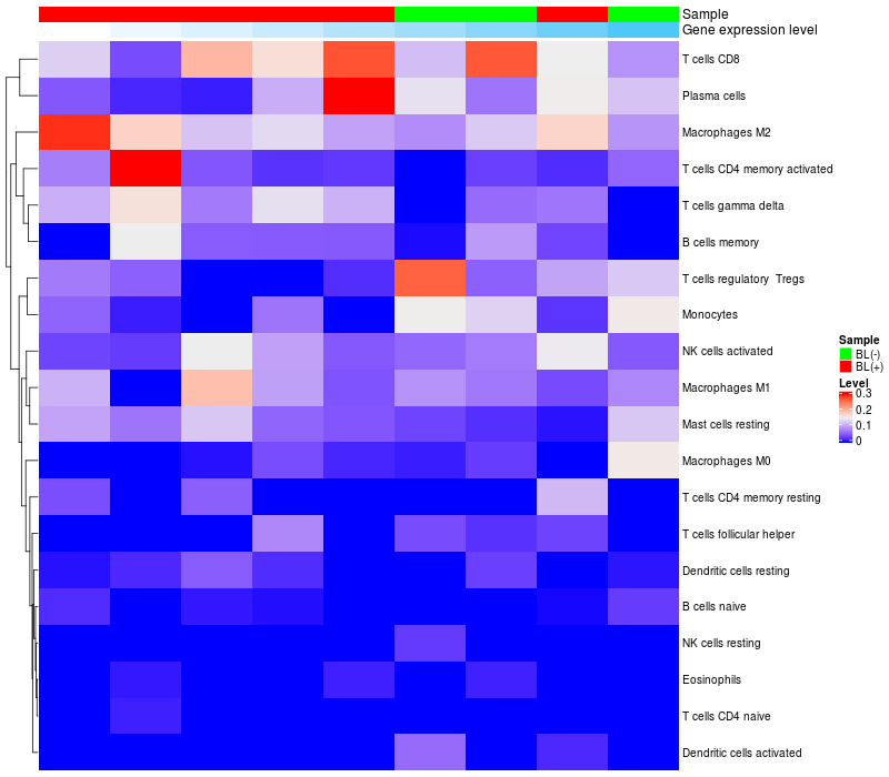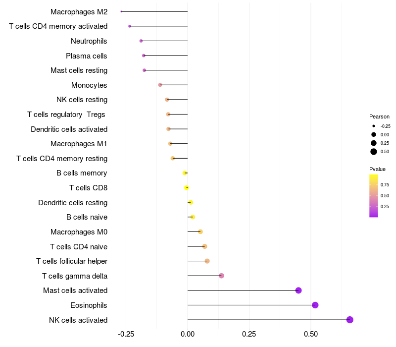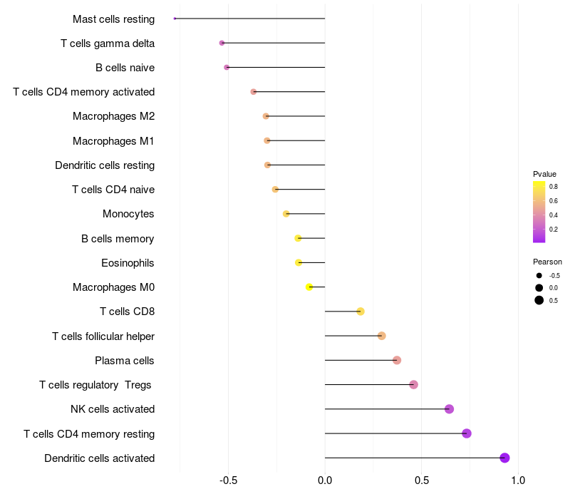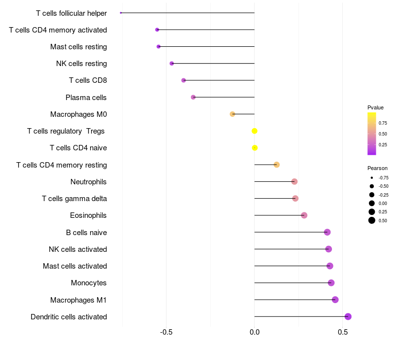 Lollipop of C21orf91-OT1 expression and immune infiltrating cell level correlation result in EBV+ samples