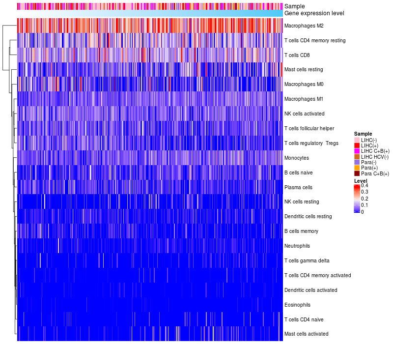 Liver hepatocellular carcinoma HCV (HBV+)(86), Liver hepatocellular carcinoma HCV (HBV-)(19), Liver hepatocellular carcinoma (HBV+)(209), Liver hepatocellular carcinoma (HBV+)(60), Paracancerous HCV (HBV+)(4), Paracancerous (HBV-)(28), Paracancerous (HBV+)(18) |