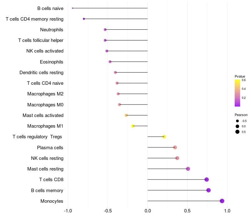 Lollipop of CD14 expression and immune infiltrating cell level correlation result in HBV+ Liver cirrhosis samples
