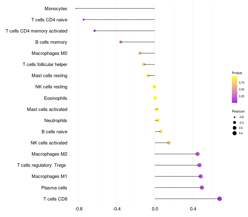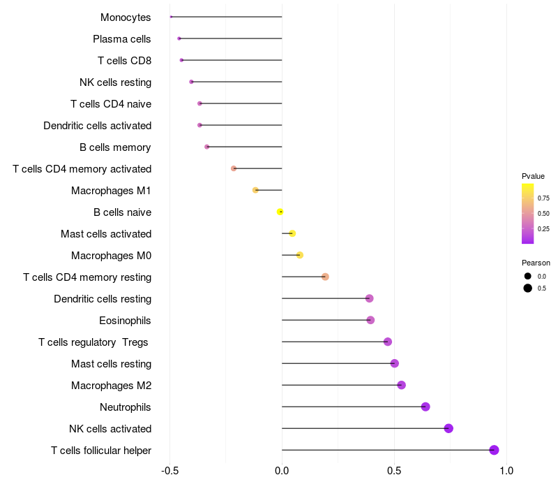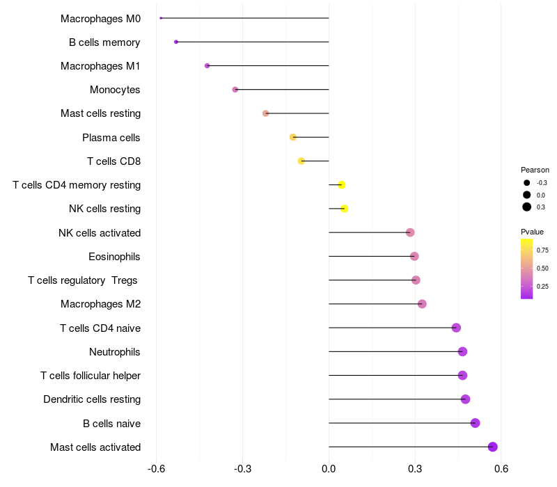 Lollipop of CD163L1 expression and immune infiltrating cell level correlation result in HBV+ Liver cirrhosis samples