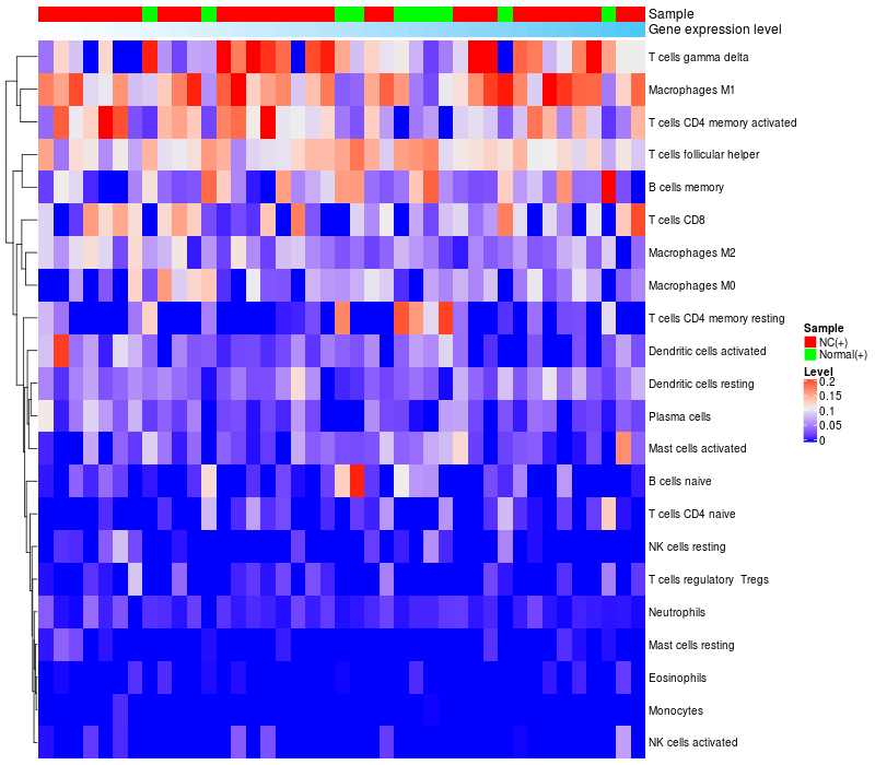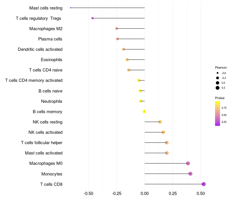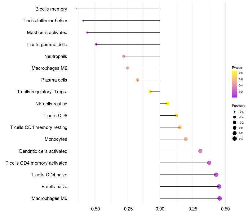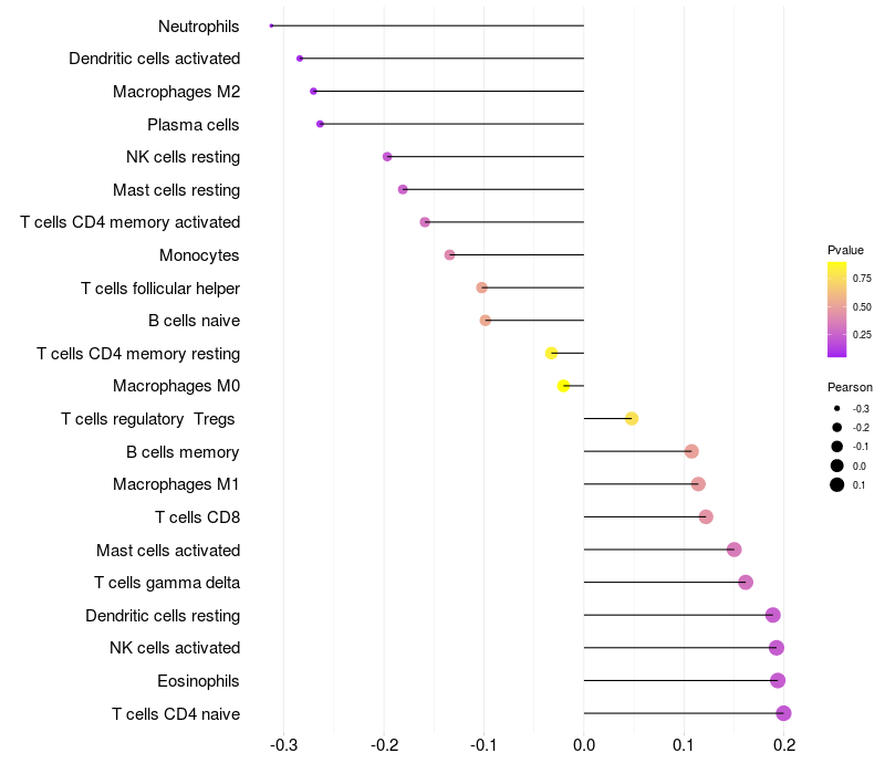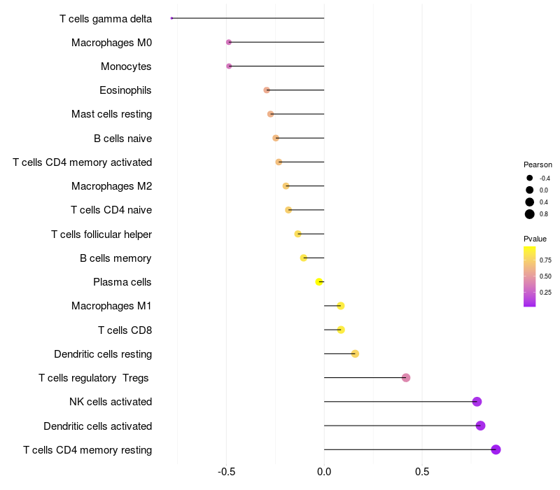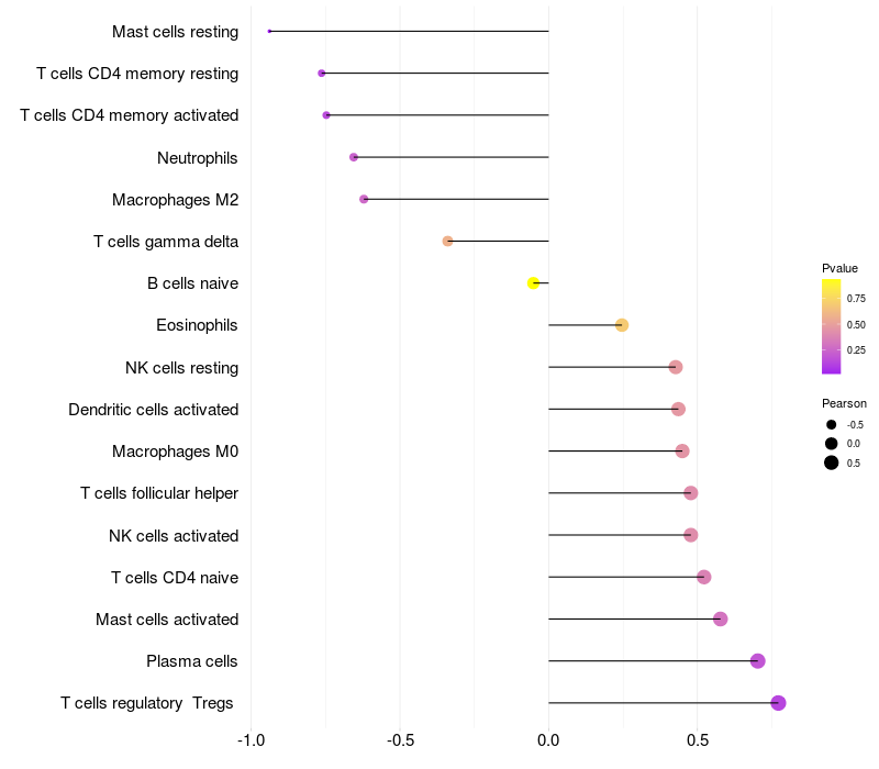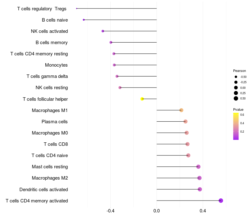 Lollipop of CD207 expression and immune infiltrating cell level correlation result in EBV+ samples