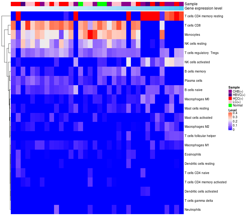 Chronic hepatitis B patients (HBV+)(10),Hepatocellular carcinoma (HBV+)(10),Liver cirrhosis(HBV+)(10),Normal(3),HBV carriers (3) |