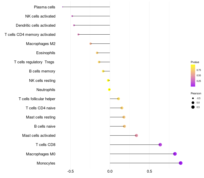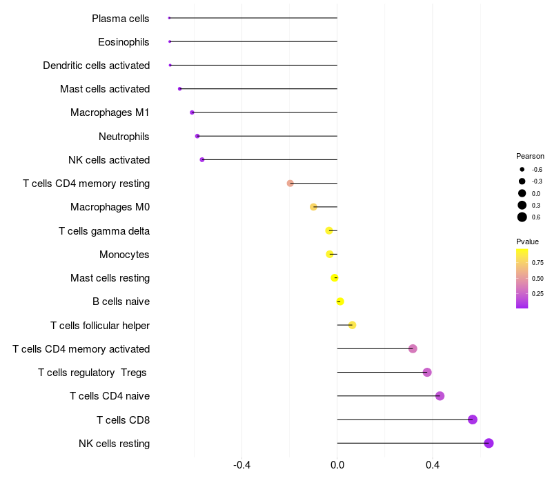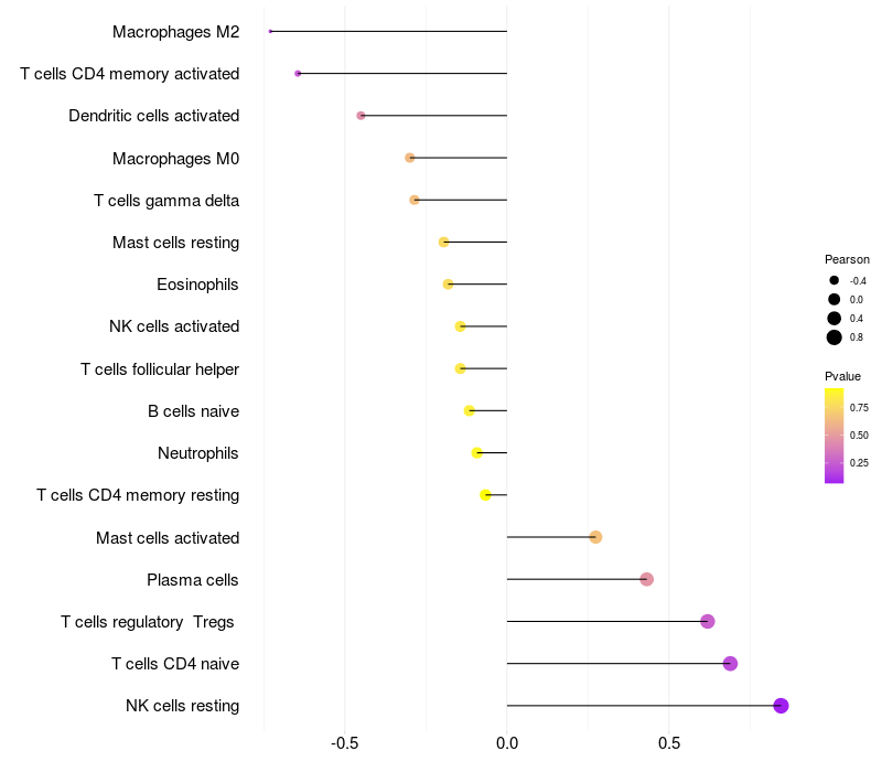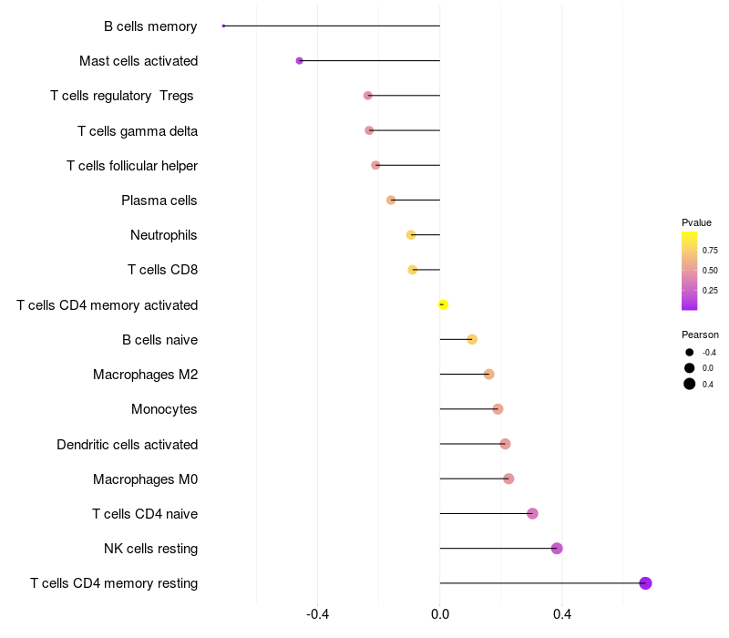Lollipop of CD99L2 expression and immune infiltrating cell level correlation result in EBV+ samples