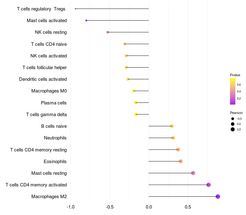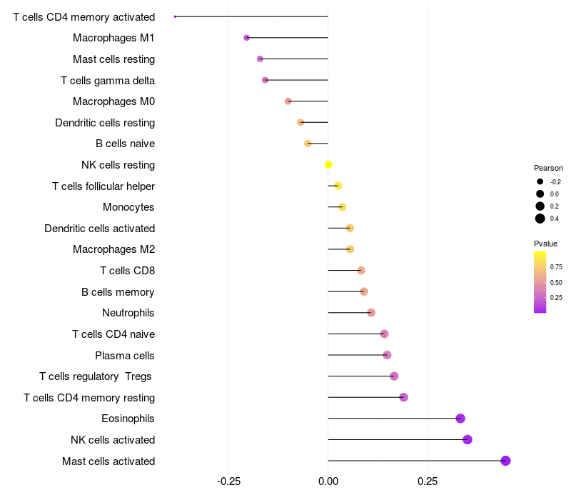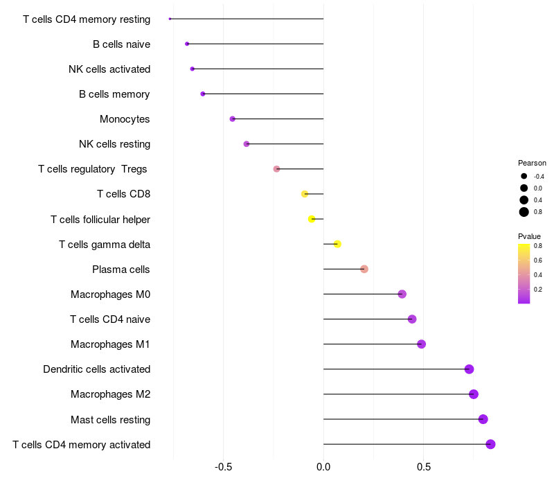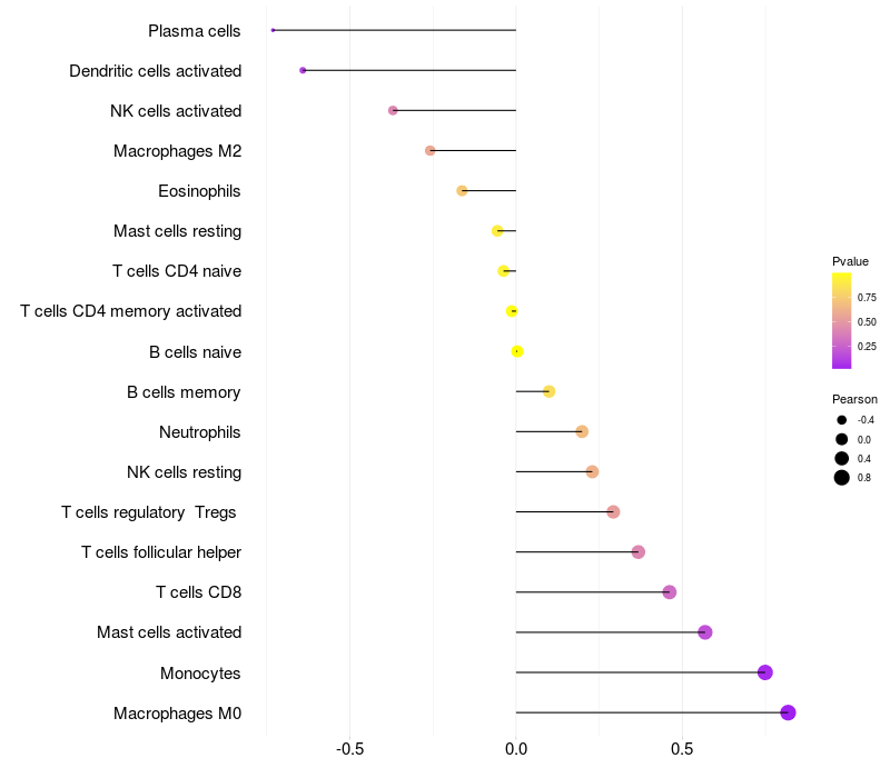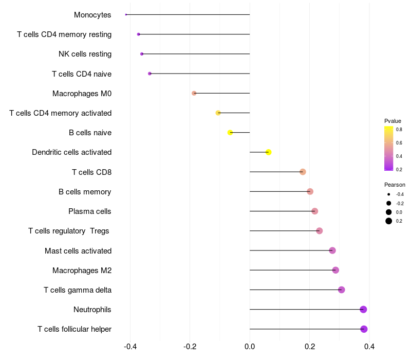 Lollipop of CDH13 expression and immune infiltrating cell level correlation result in EBV+ samples