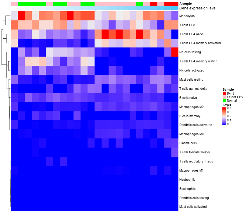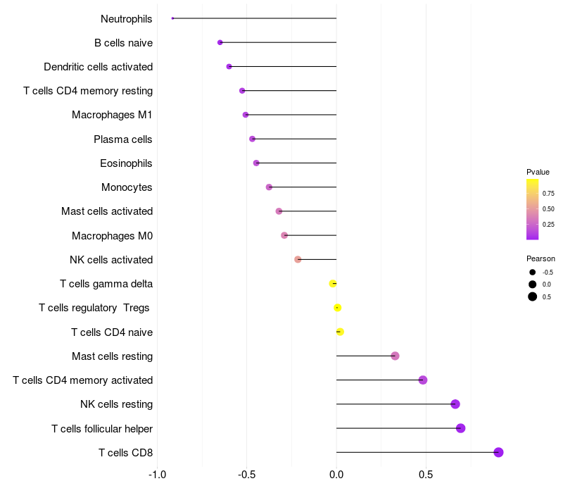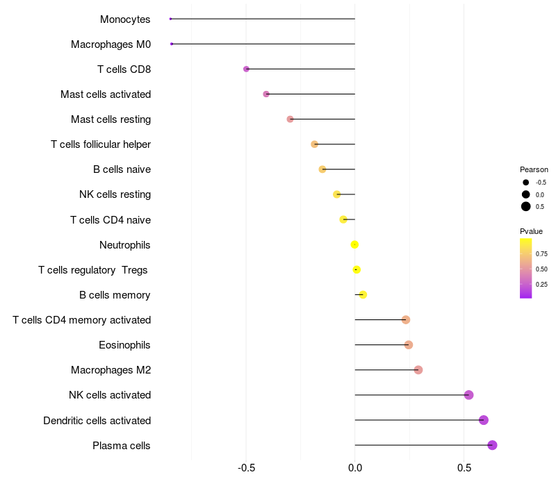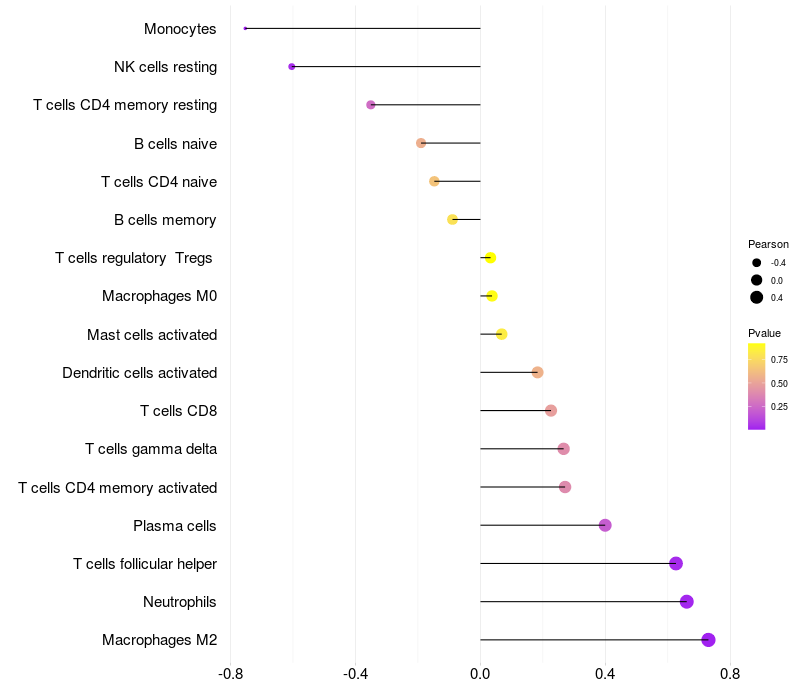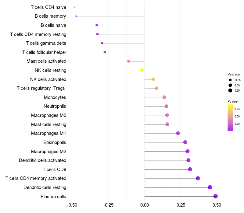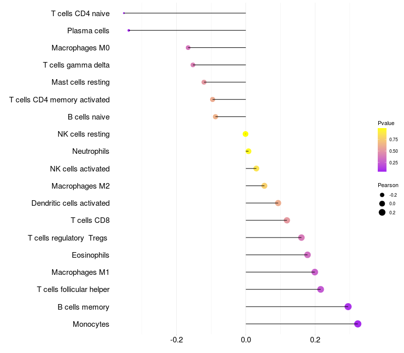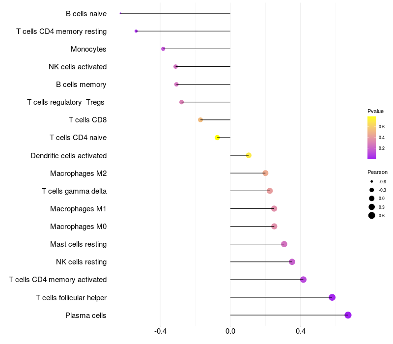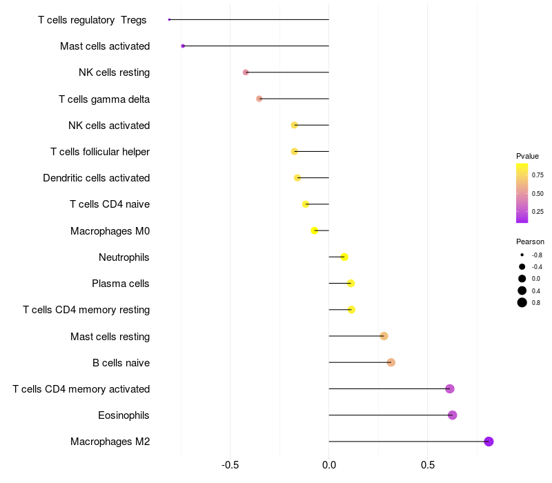 Lollipop of CHCHD3 expression and immune infiltrating cell level correlation result in EBV+ samples