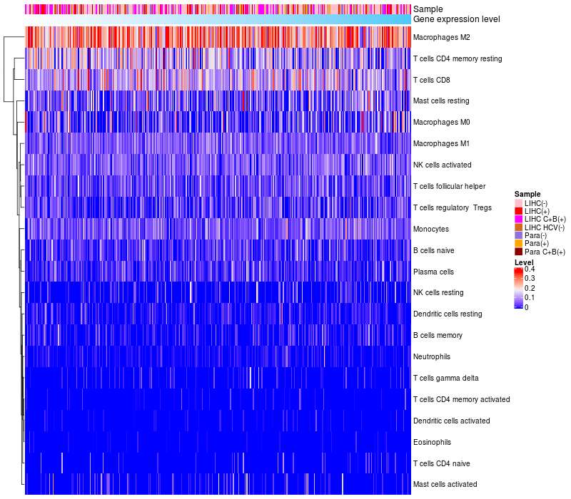 Liver hepatocellular carcinoma HCV (HBV+)(86), Liver hepatocellular carcinoma HCV (HBV-)(19), Liver hepatocellular carcinoma (HBV+)(209), Liver hepatocellular carcinoma (HBV+)(60), Paracancerous HCV (HBV+)(4), Paracancerous (HBV-)(28), Paracancerous (HBV+)(18) |