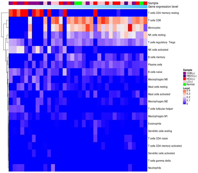 Chronic hepatitis B patients (HBV+)(10),Hepatocellular carcinoma (HBV+)(10),Liver cirrhosis(HBV+)(10),Normal(3),HBV carriers (3) |