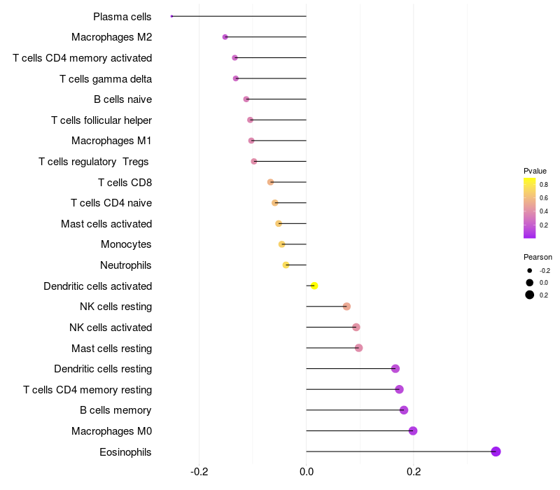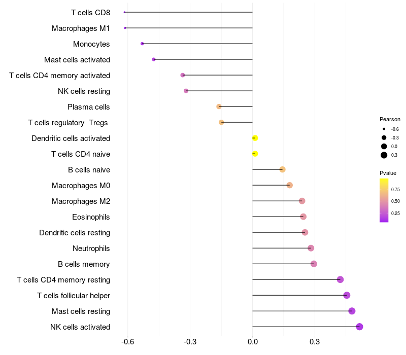 Lollipop of COMMD10 expression and immune infiltrating cell level correlation result in HBV+ Liver cirrhosis samples
