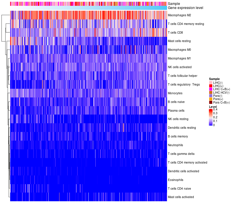 Liver hepatocellular carcinoma HCV (HBV+)(86), Liver hepatocellular carcinoma HCV (HBV-)(19), Liver hepatocellular carcinoma (HBV+)(209), Liver hepatocellular carcinoma (HBV+)(60), Paracancerous HCV (HBV+)(4), Paracancerous (HBV-)(28), Paracancerous (HBV+)(18) |