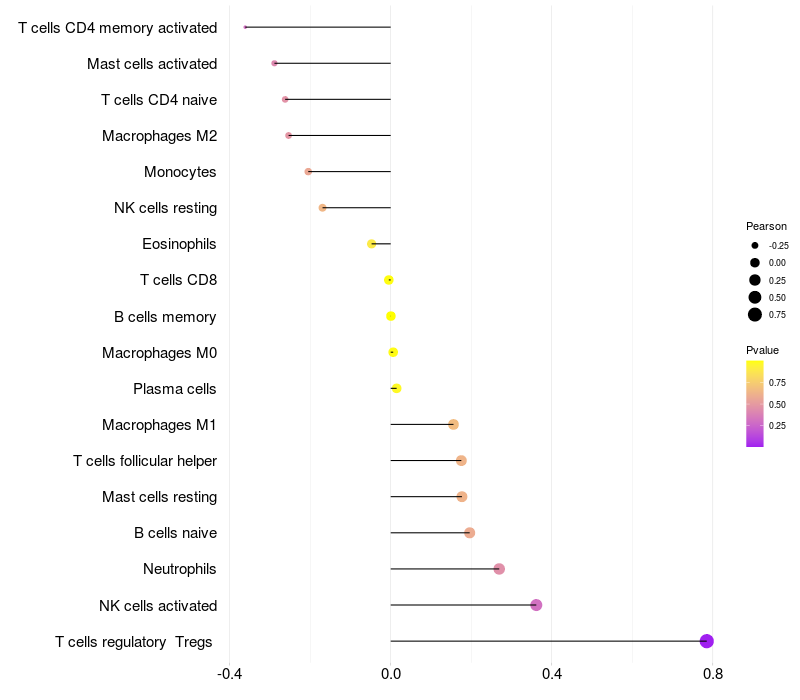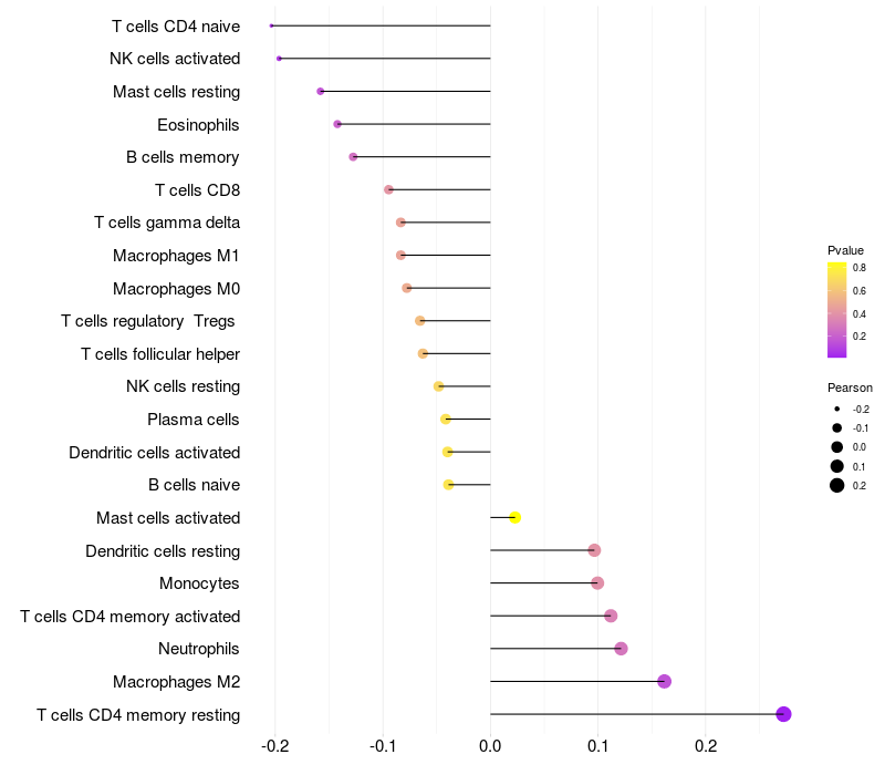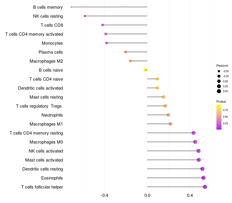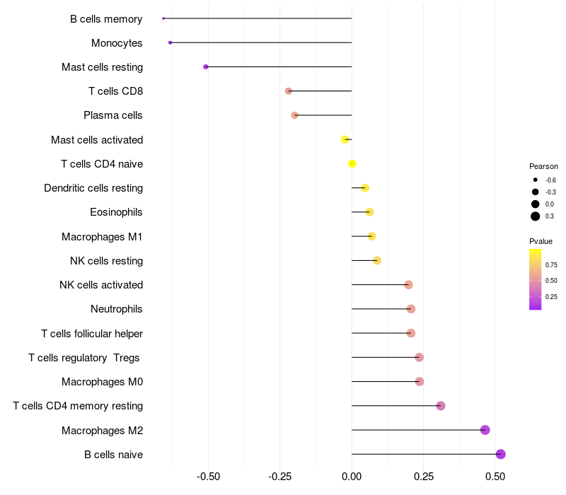 Lollipop of CPM expression and immune infiltrating cell level correlation result in HBV+ Liver cirrhosis samples