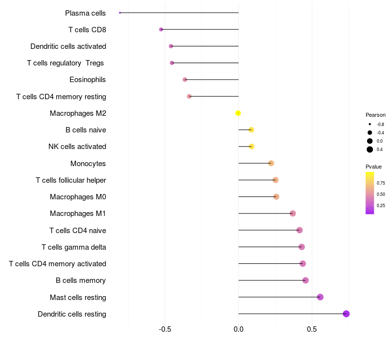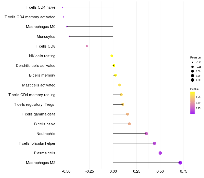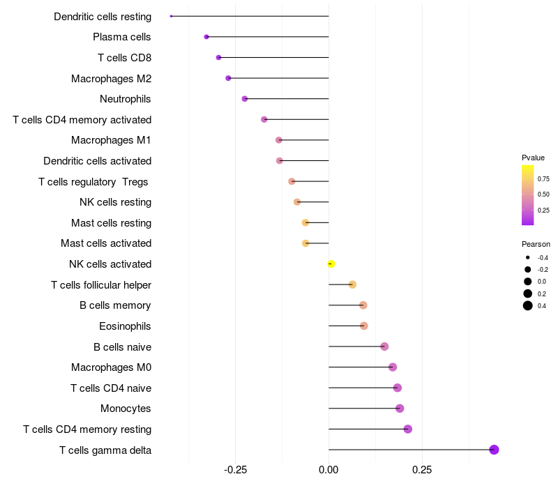 Lollipop of CREBL2 expression and immune infiltrating cell level correlation result in EBV+ samples