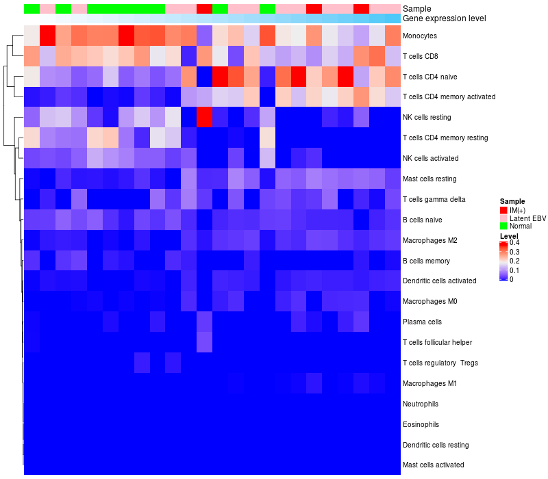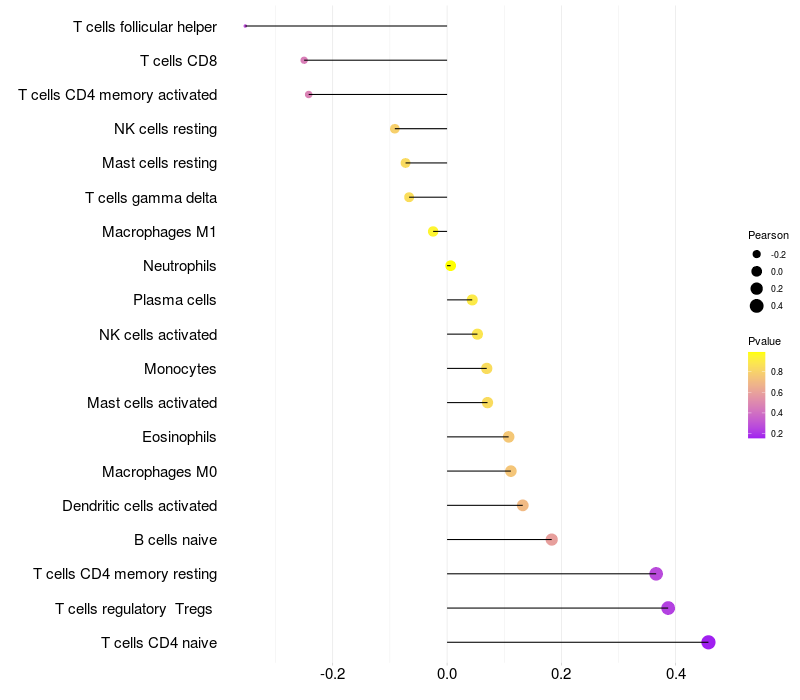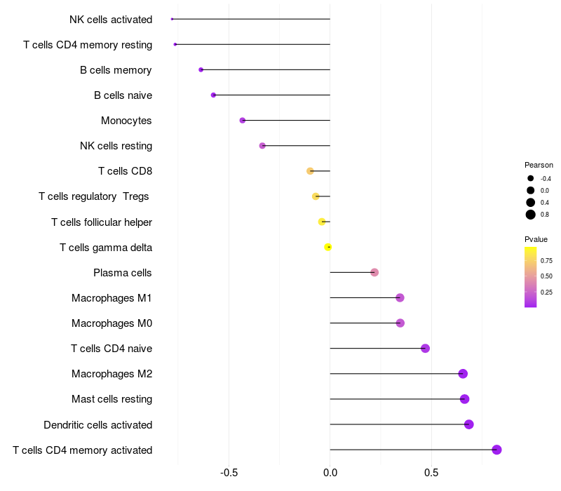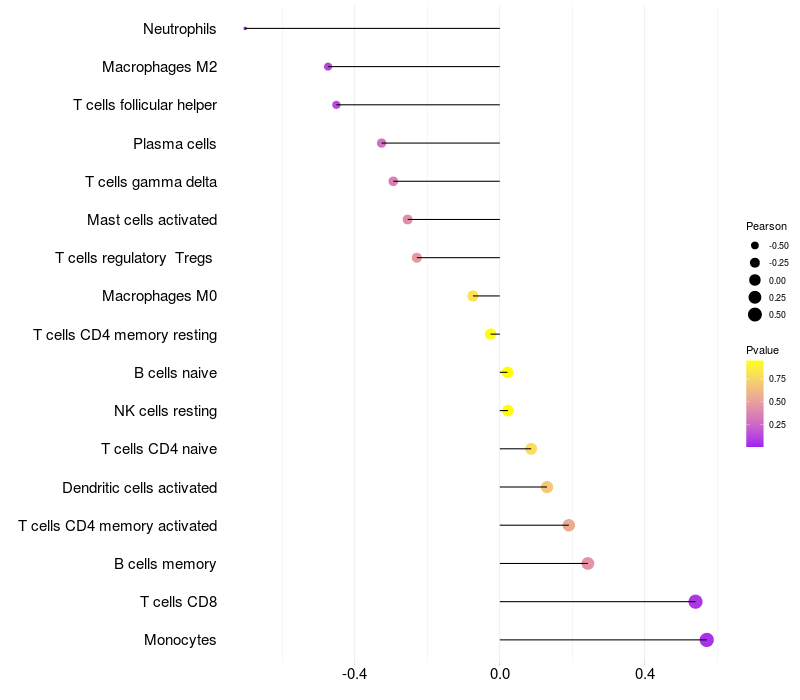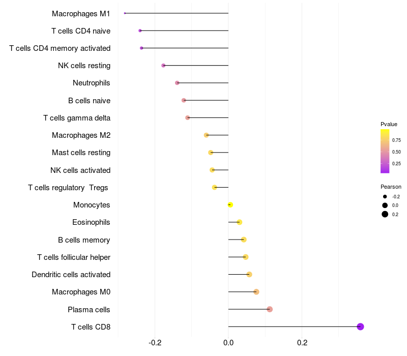 Lollipop of CST11 expression and immune infiltrating cell level correlation result in EBV+ samples