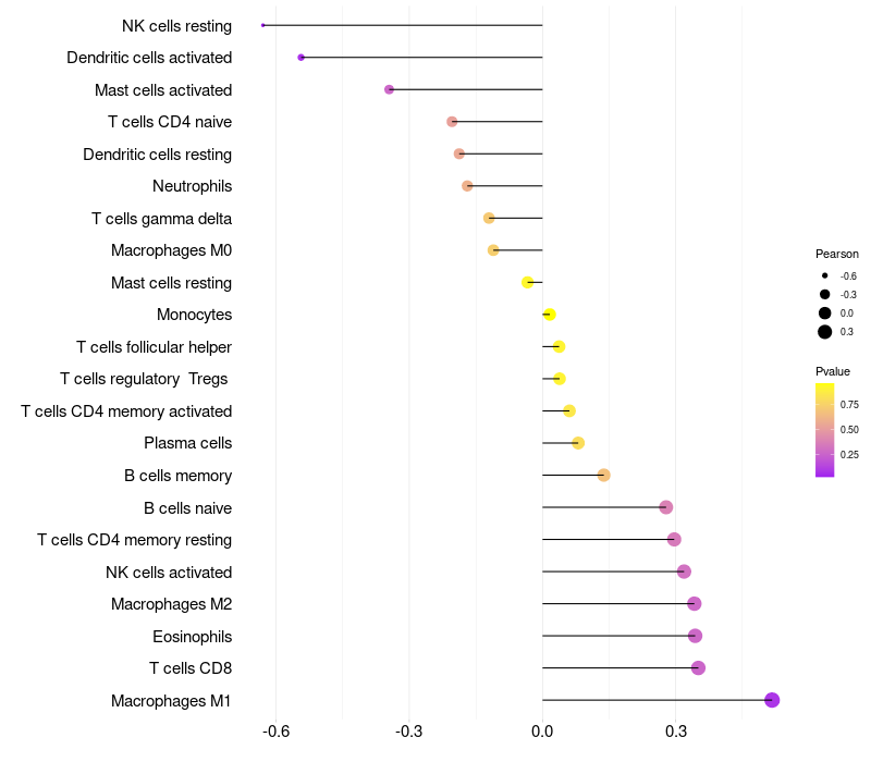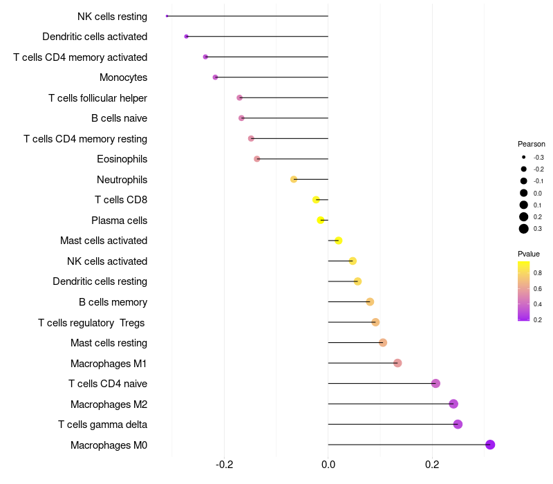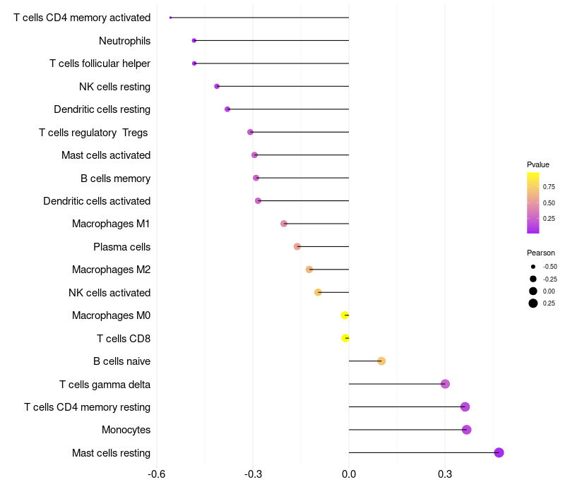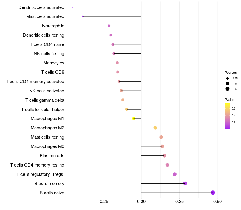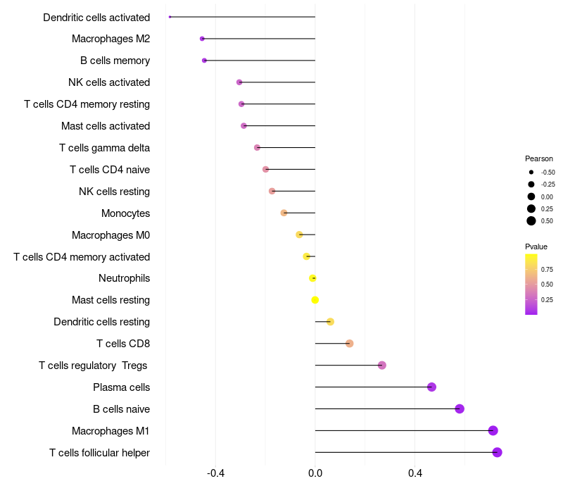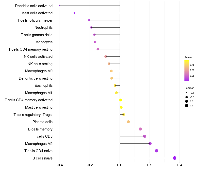Lollipop of DPT expression and immune infiltrating cell level correlation result in HPV+ samples