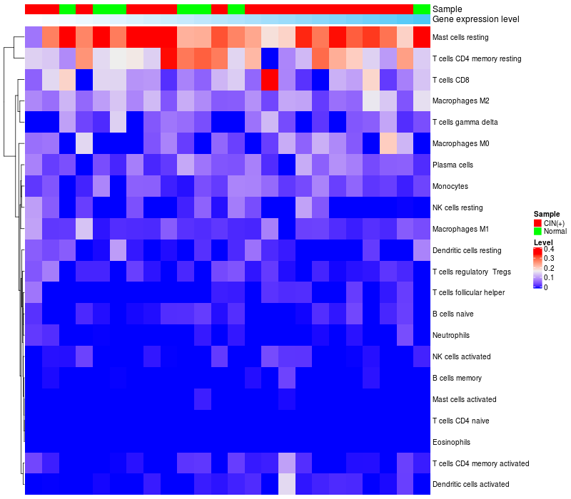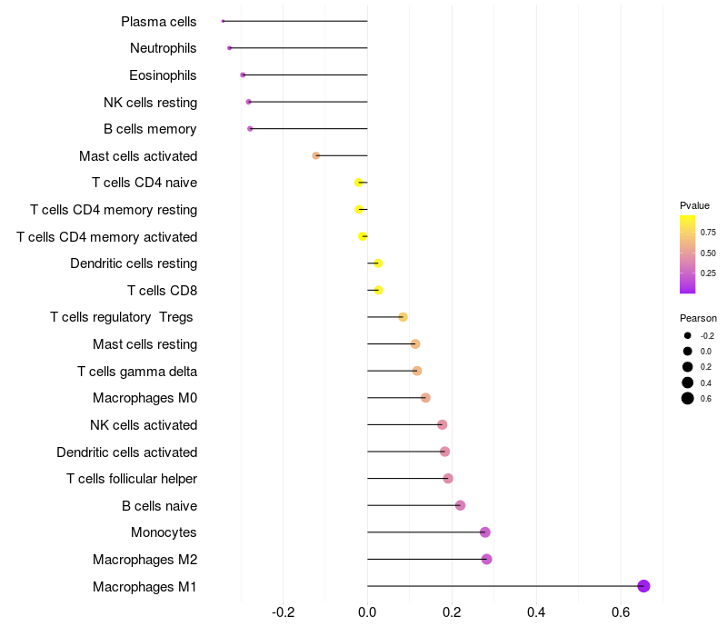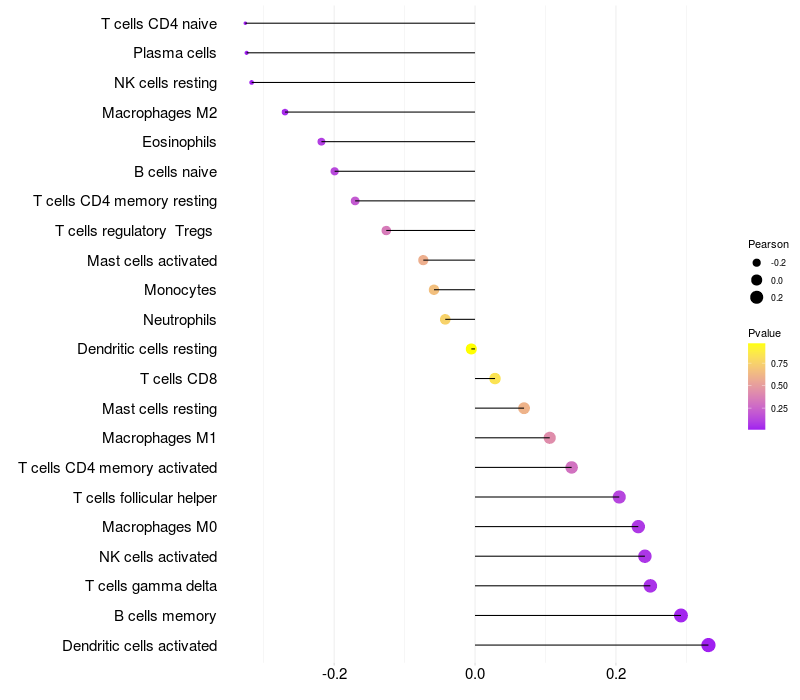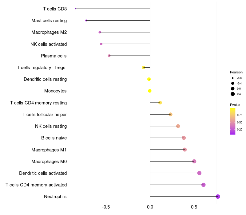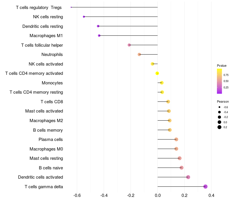 Lollipop of DRAM1 expression and immune infiltrating cell level correlation result in HPV+ samples