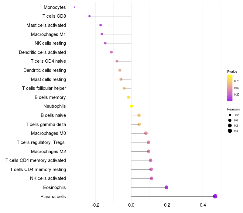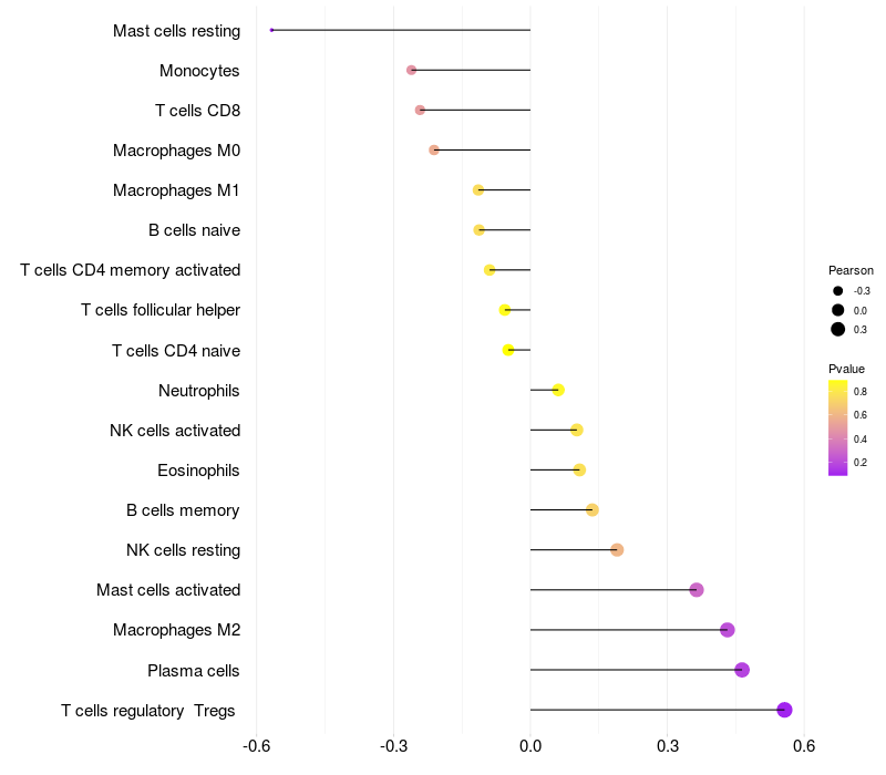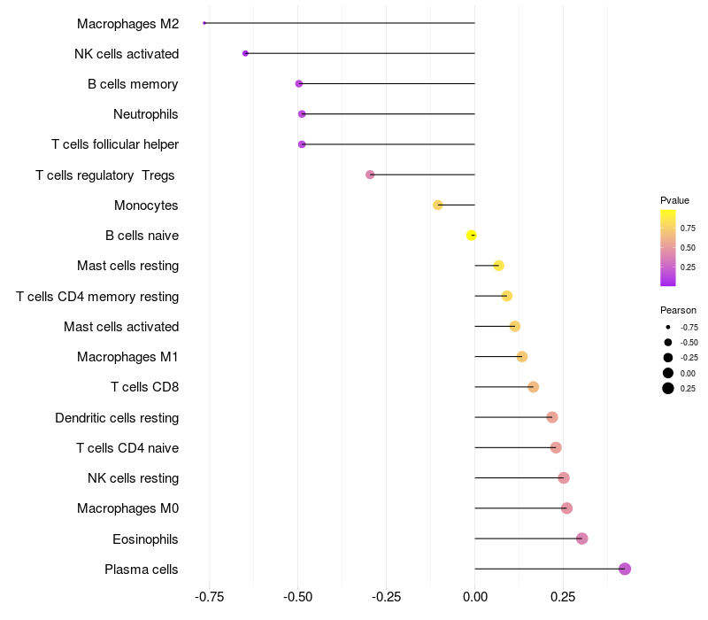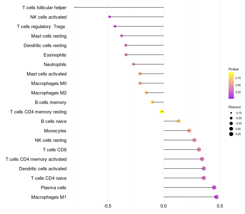 Lollipop of EDNRA expression and immune infiltrating cell level correlation result in HBV+ Liver cirrhosis samples