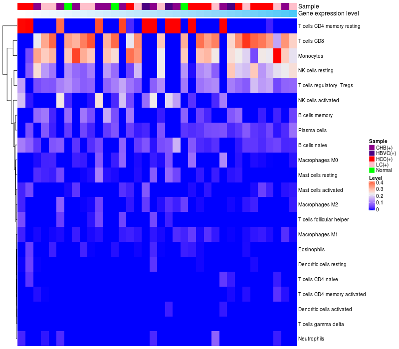 Liver hepatocellular carcinoma HCV (HBV+)(86), Liver hepatocellular carcinoma HCV (HBV-)(19), Liver hepatocellular carcinoma (HBV+)(209), Liver hepatocellular carcinoma (HBV+)(60), Paracancerous HCV (HBV+)(4), Paracancerous (HBV-)(28), Paracancerous (HBV+)(18) |