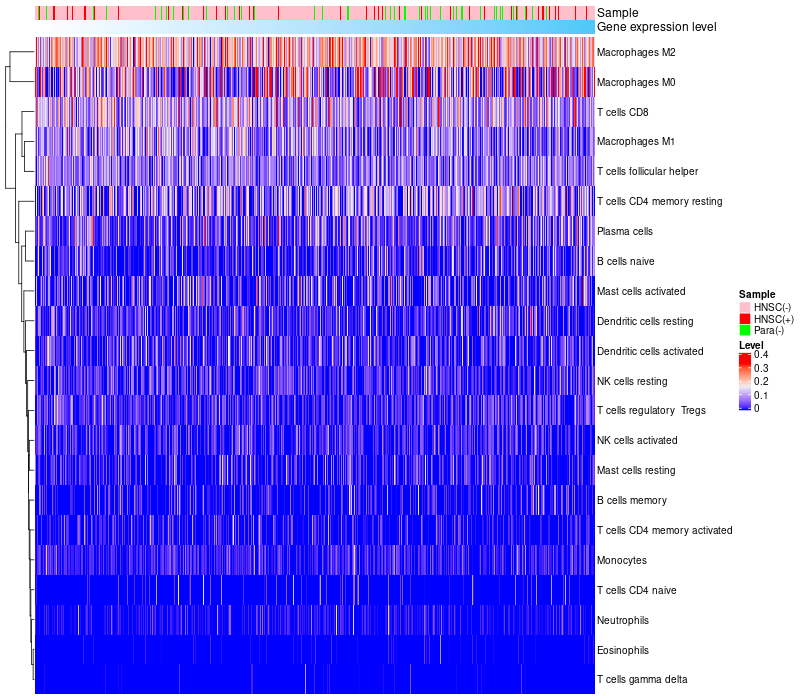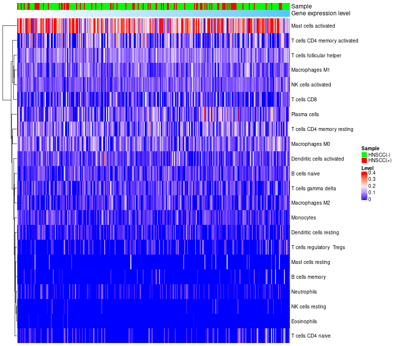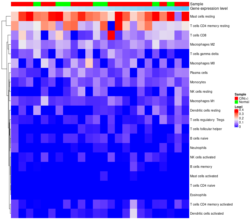 • Left: Heatmap of target gene expression and the level of various types of immune cells (cell type fractions) in all samples based on CIBERSORT method.