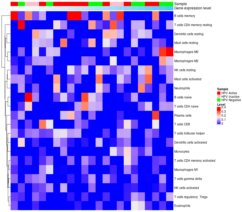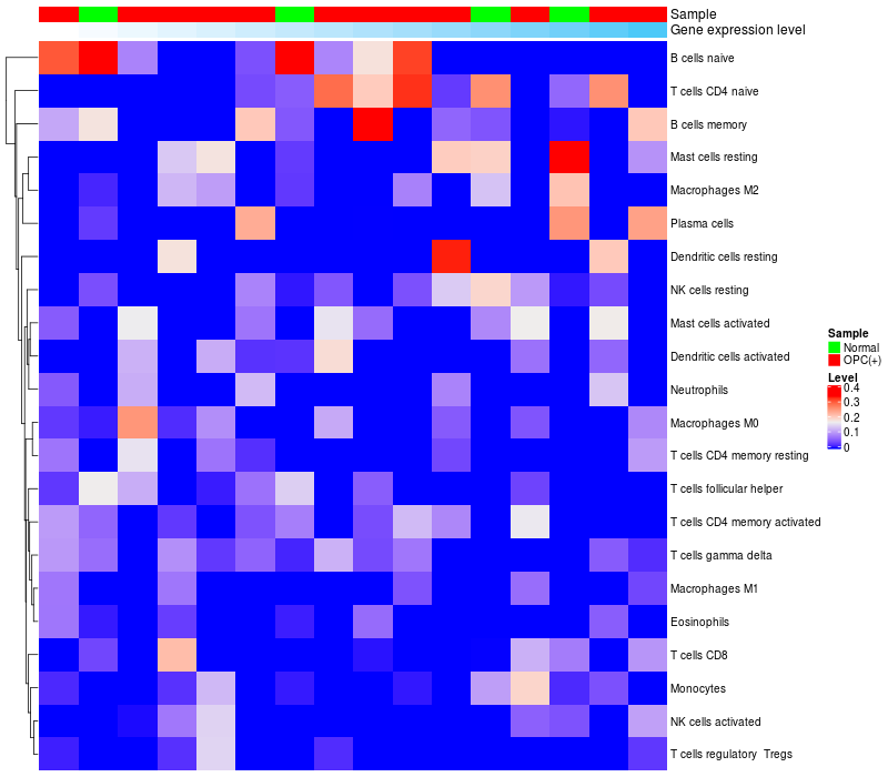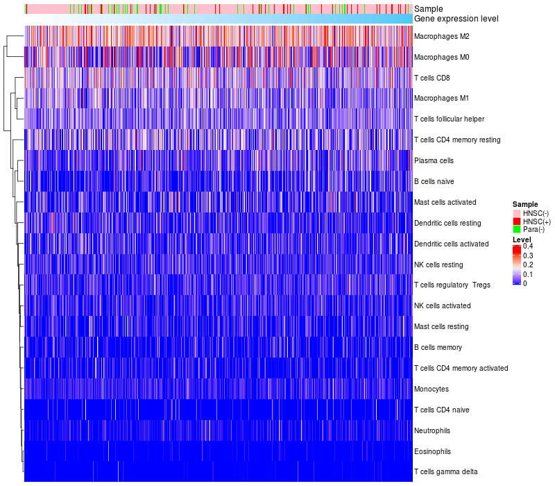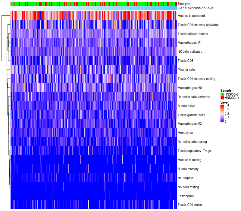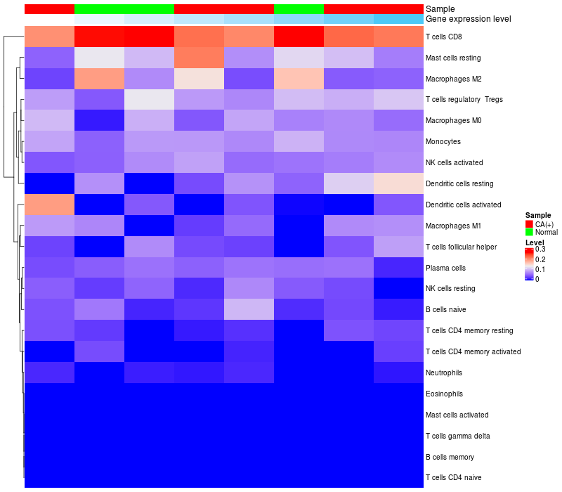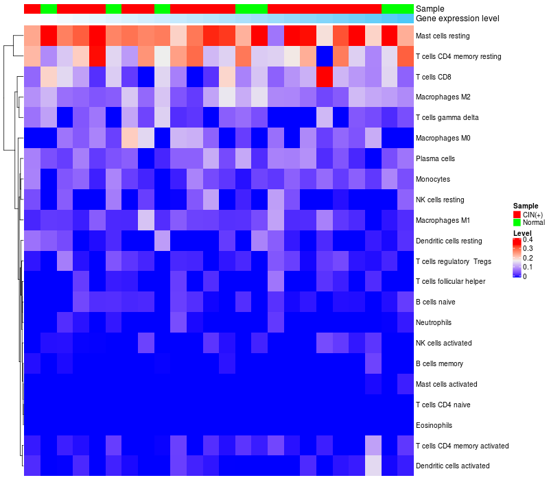 • Left: Heatmap of target gene expression and the level of various types of immune cells (cell type fractions) in all samples based on CIBERSORT method.