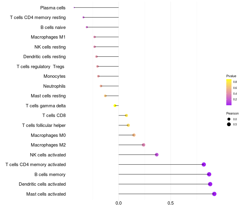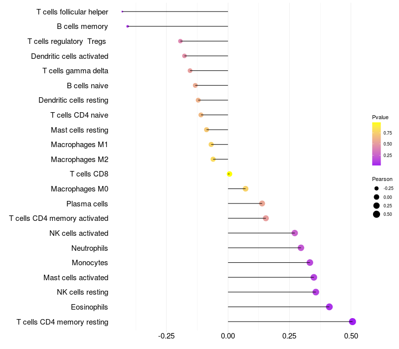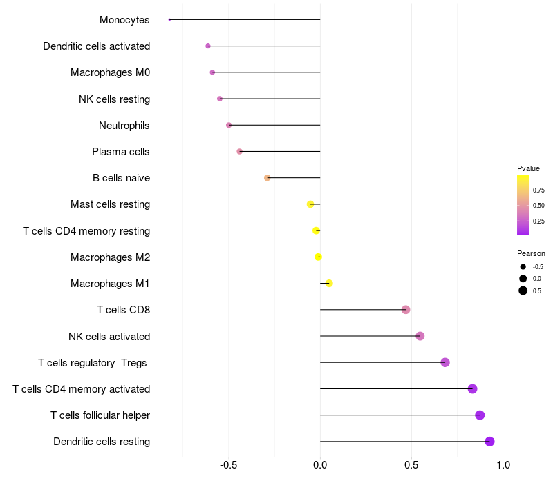 • Right: Correlation of target gene expression and the level of various types of immune cells in virus positive samples (Pearson Correlation Coefficient).