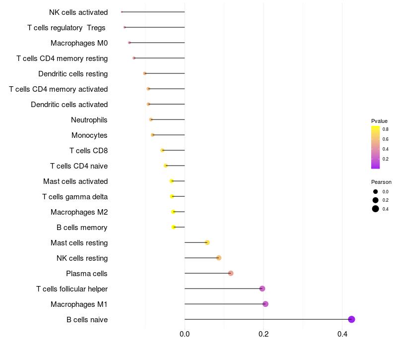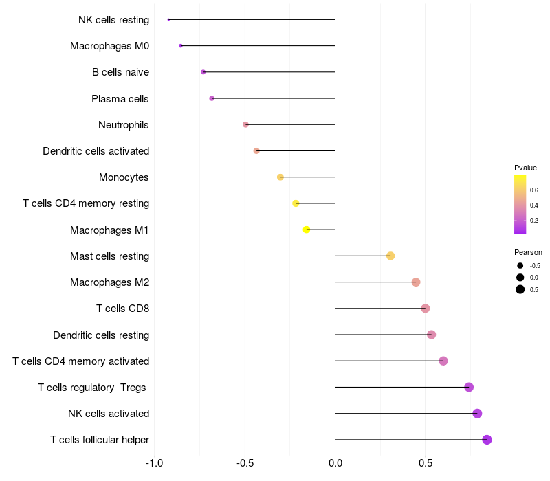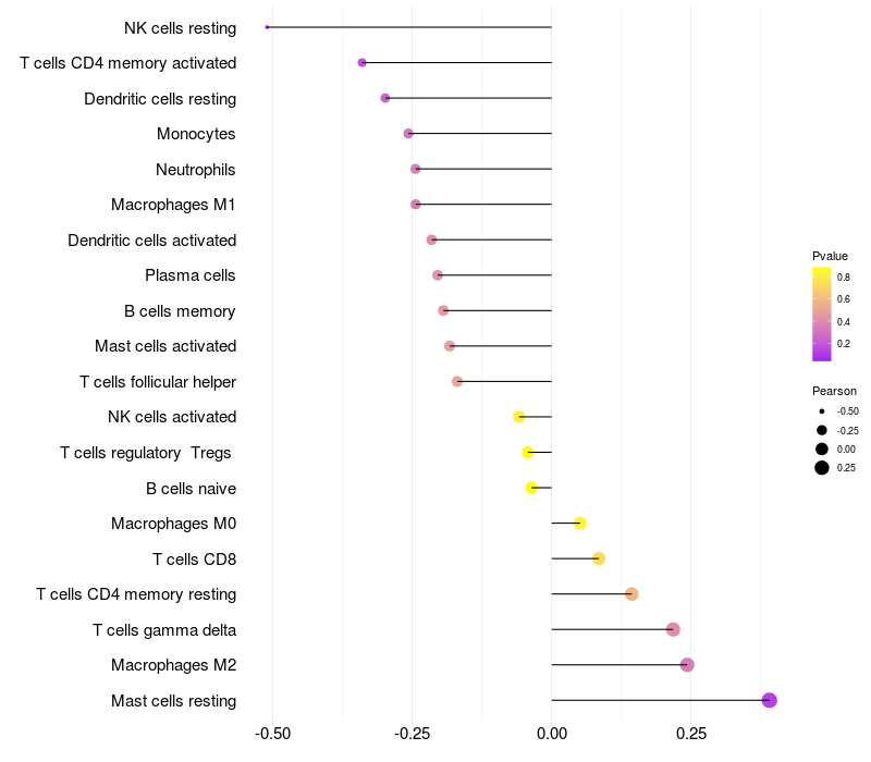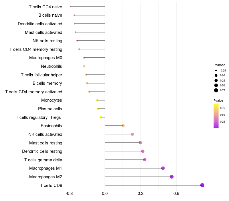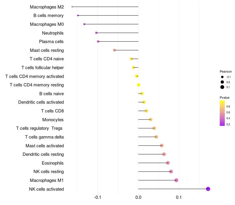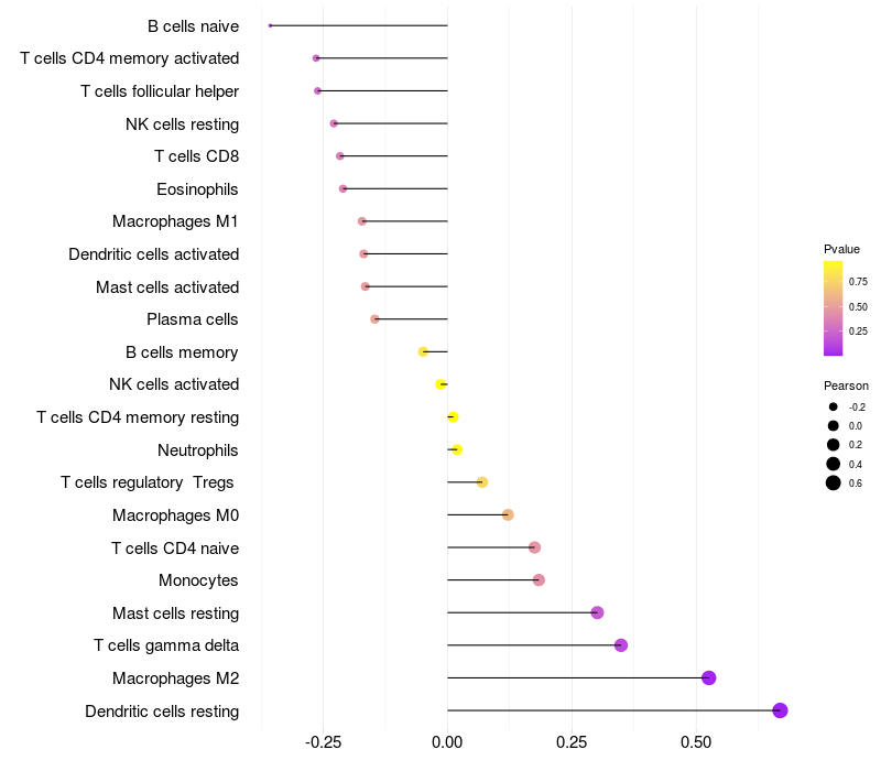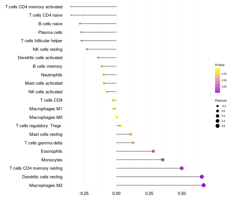 Lollipop of GATA5 expression and immune infiltrating cell level correlation result in HPV+ samples
