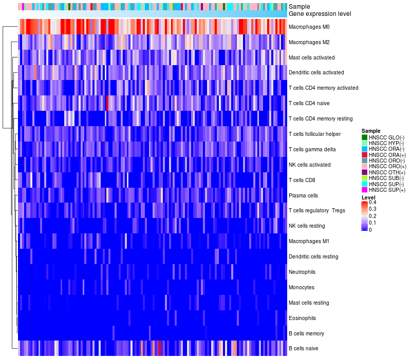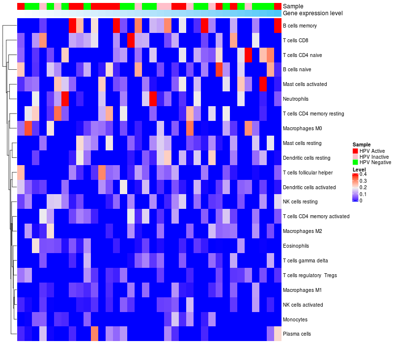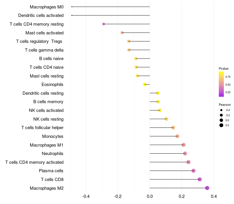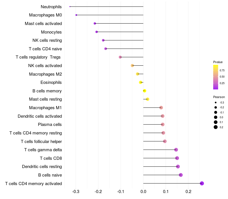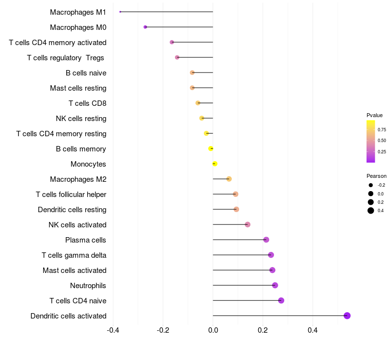 Lollipop of GHITM expression and immune infiltrating cell level correlation result in HPV+ samples