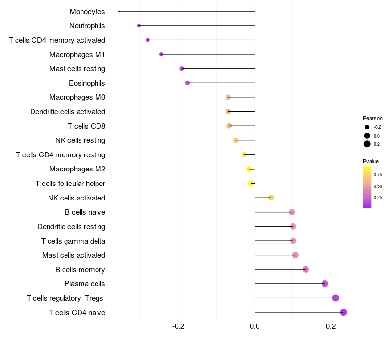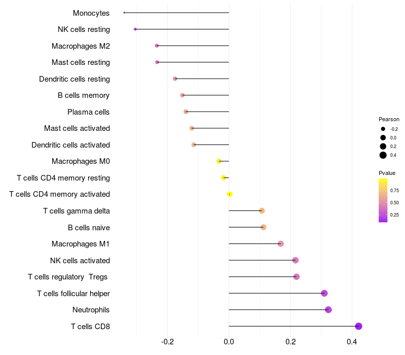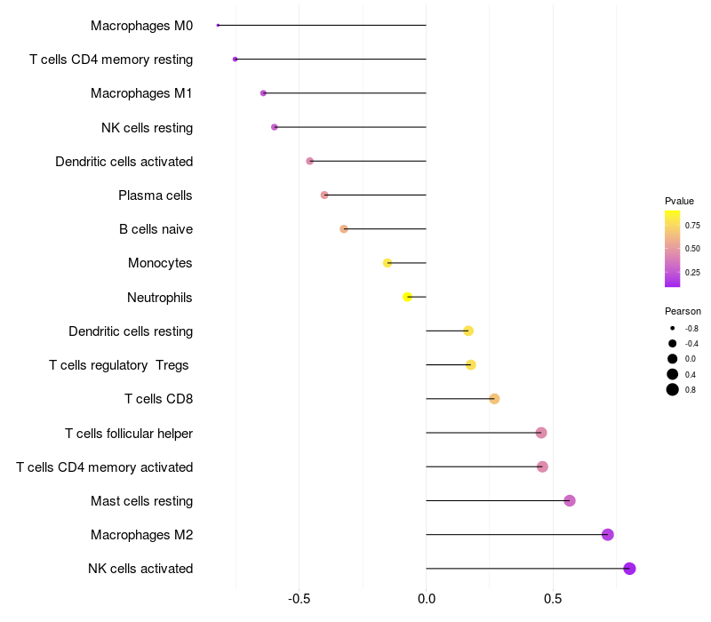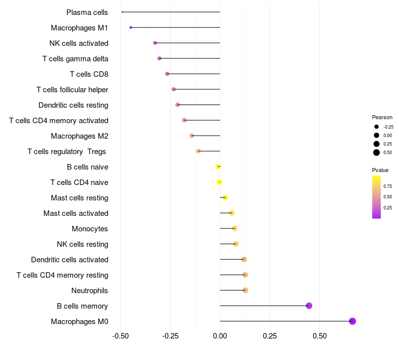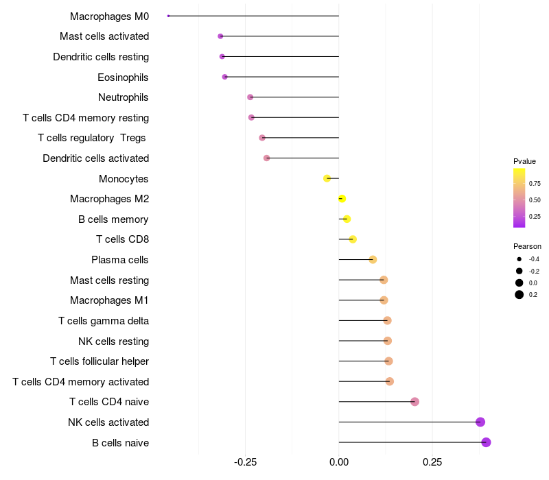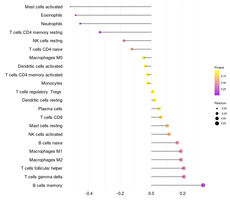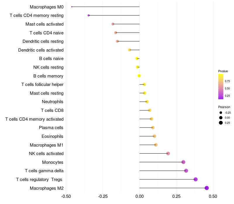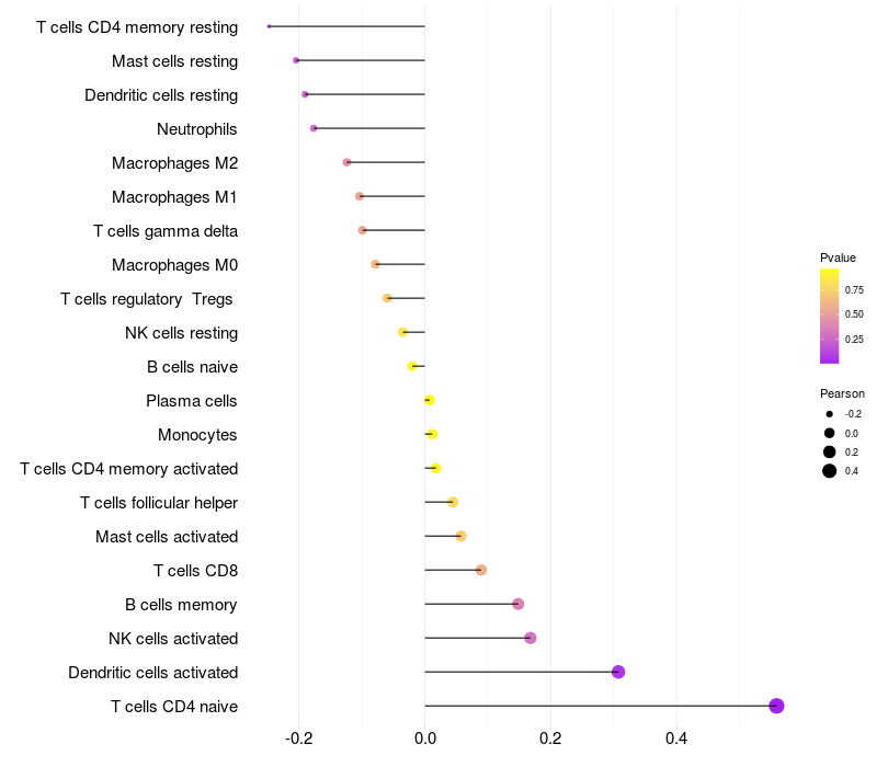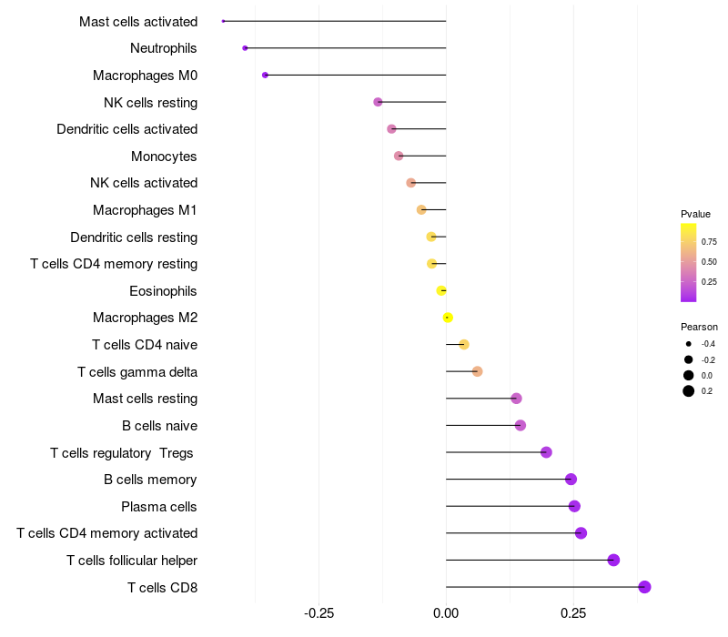 Lollipop of GKAP1 expression and immune infiltrating cell level correlation result in HPV+ samples