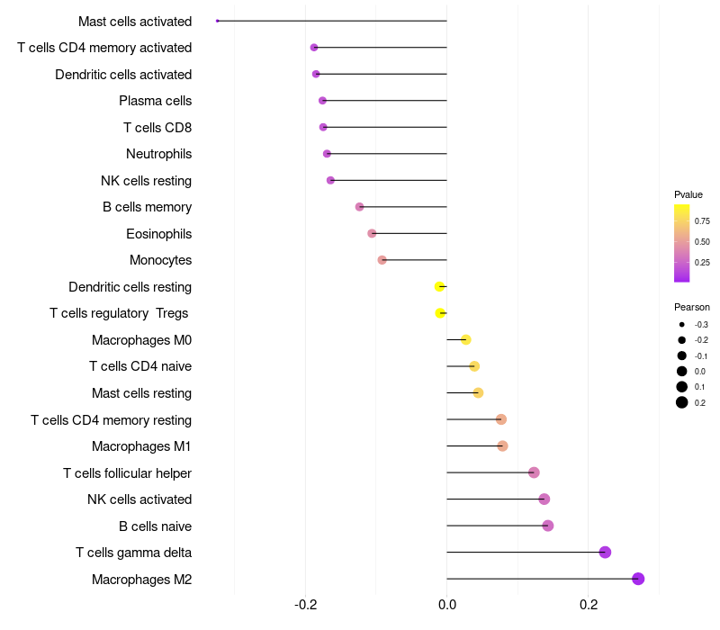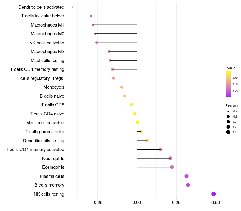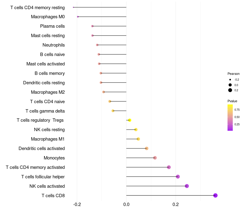 Lollipop of GOLGA6L6 expression and immune infiltrating cell level correlation result in HPV+ samples