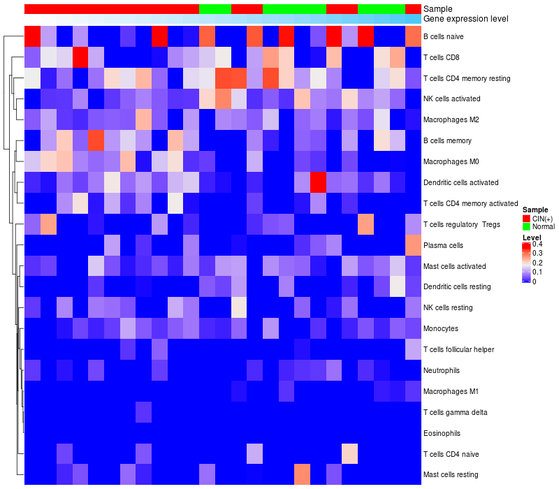 • Left: Heatmap of target gene expression and the level of various types of immune cells (cell type fractions) in all samples based on CIBERSORT method.
