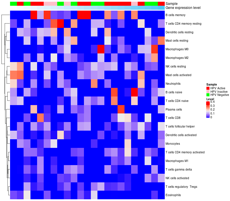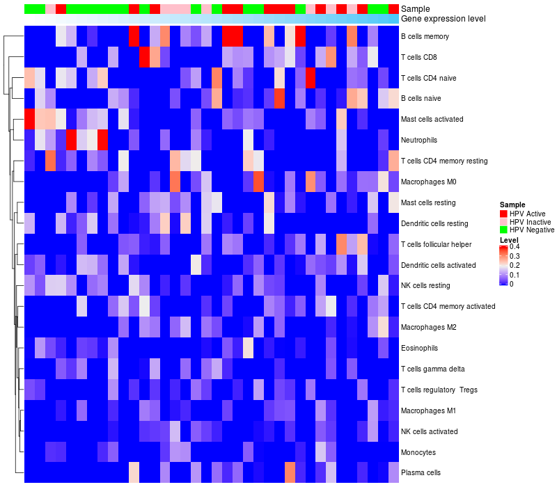 HeatMap of cell type fractions in all samples Lollipop of GOSR2 expression and immune infiltrating cell level correlation result in HPV+ samples