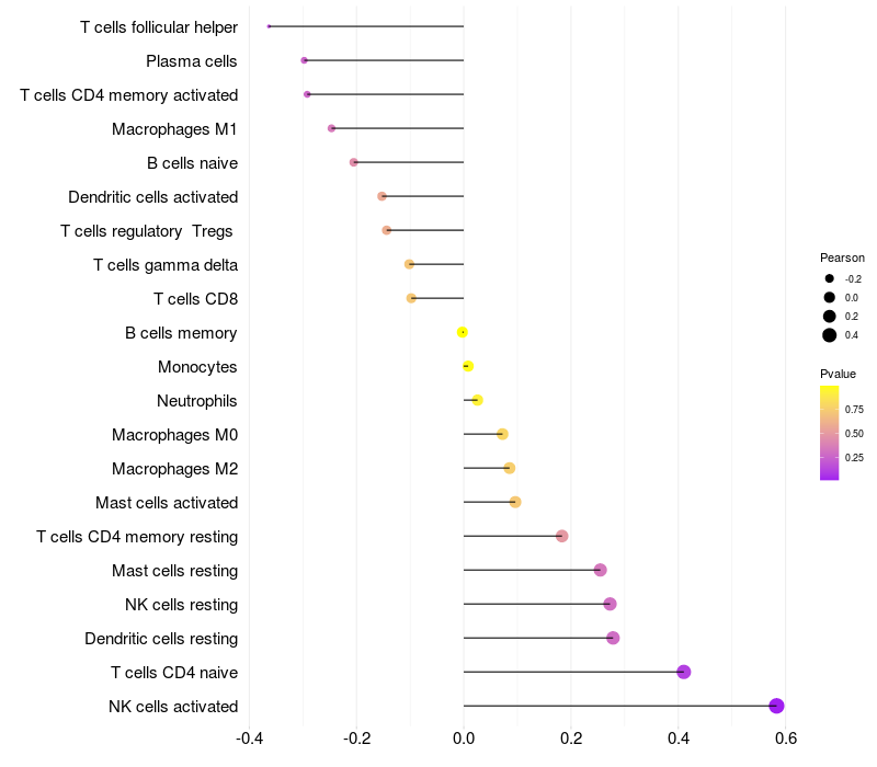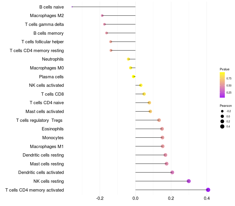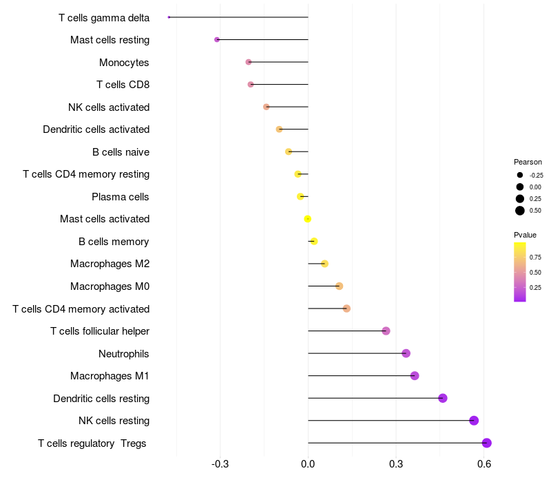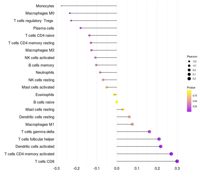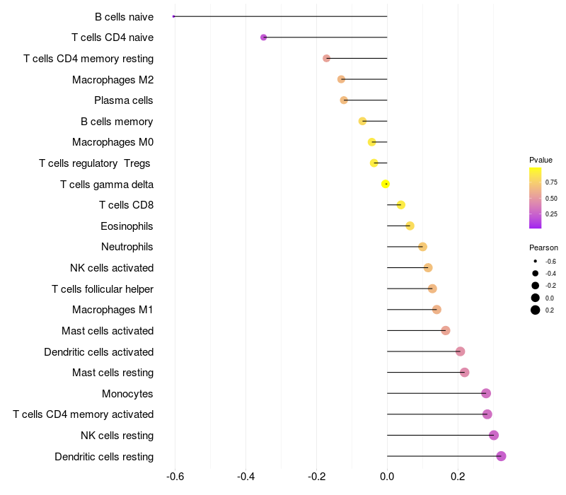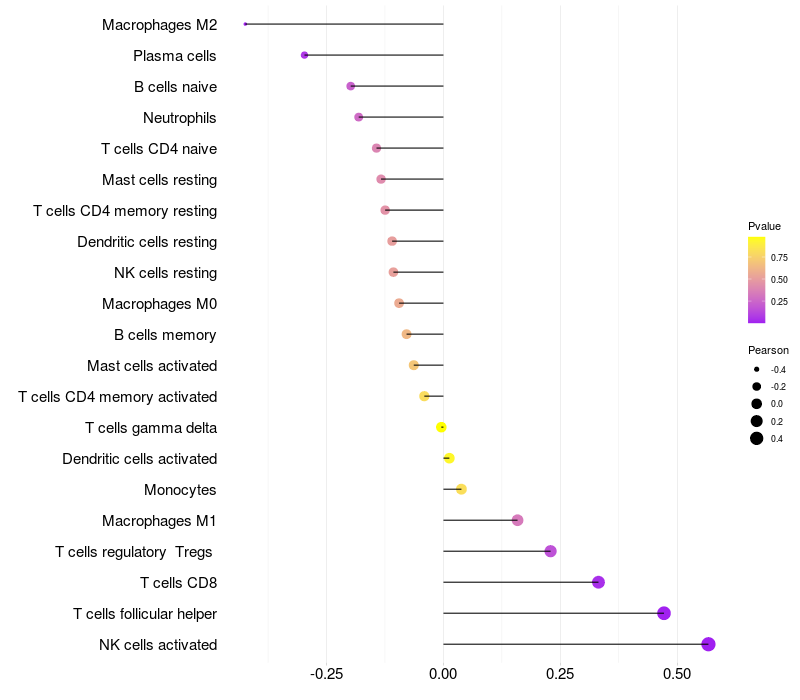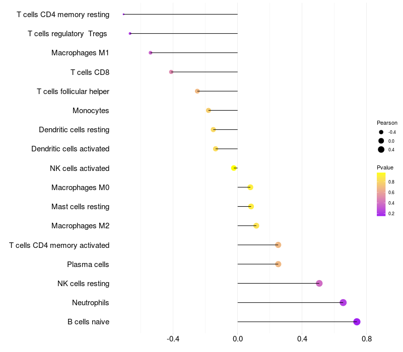 Lollipop of GRTP1 expression and immune infiltrating cell level correlation result in HPV+ samples