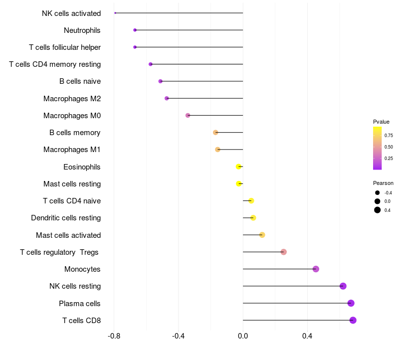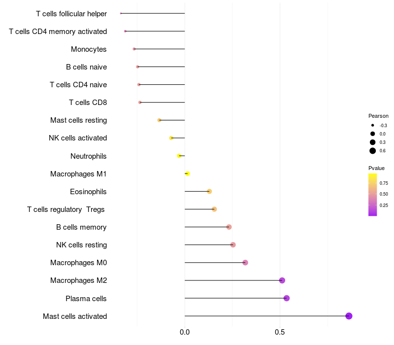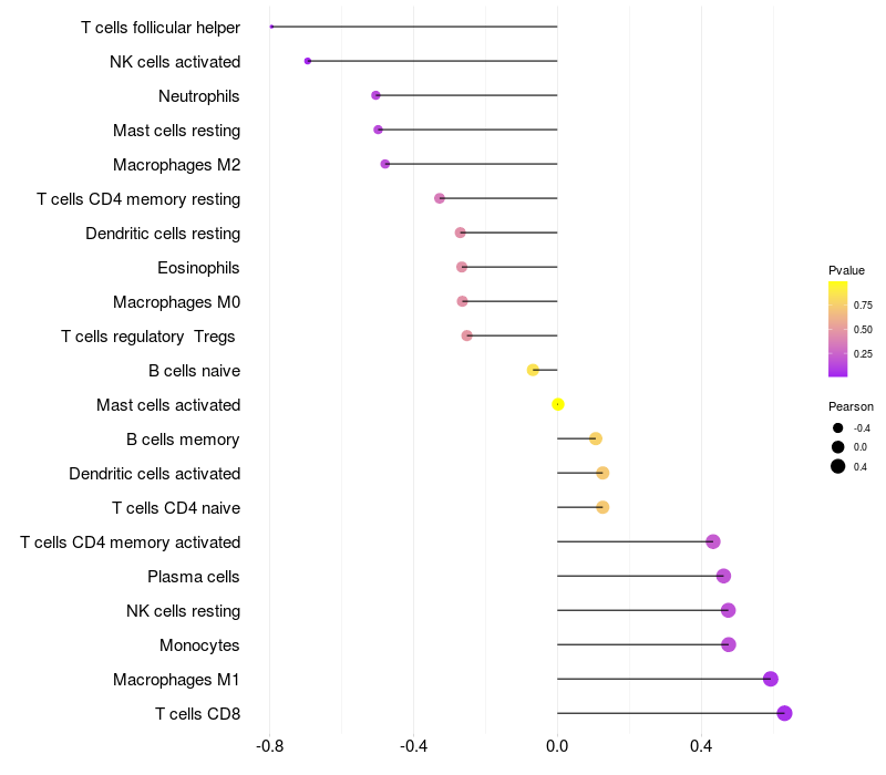 Lollipop of HPD expression and immune infiltrating cell level correlation result in HBV+ Liver cirrhosis samples