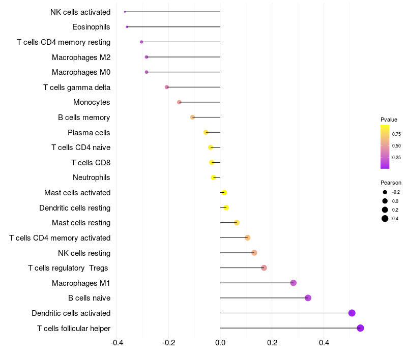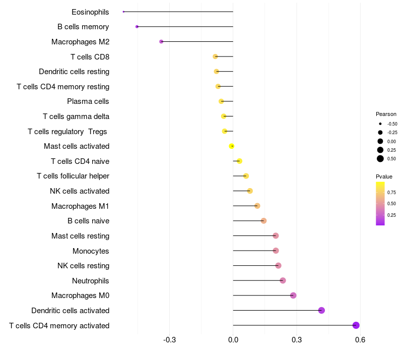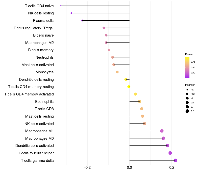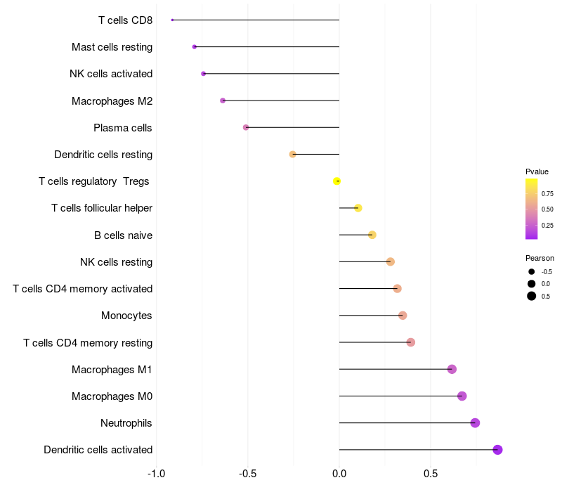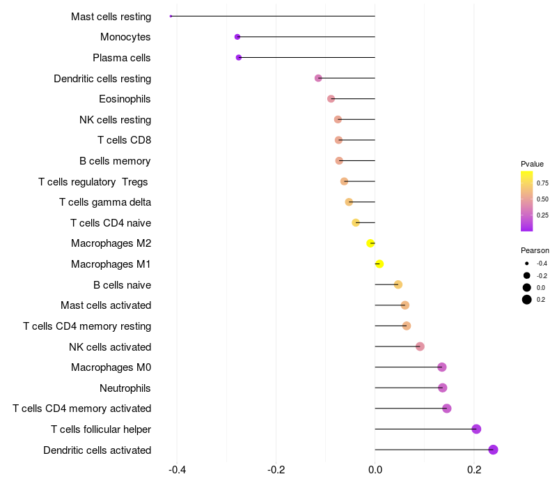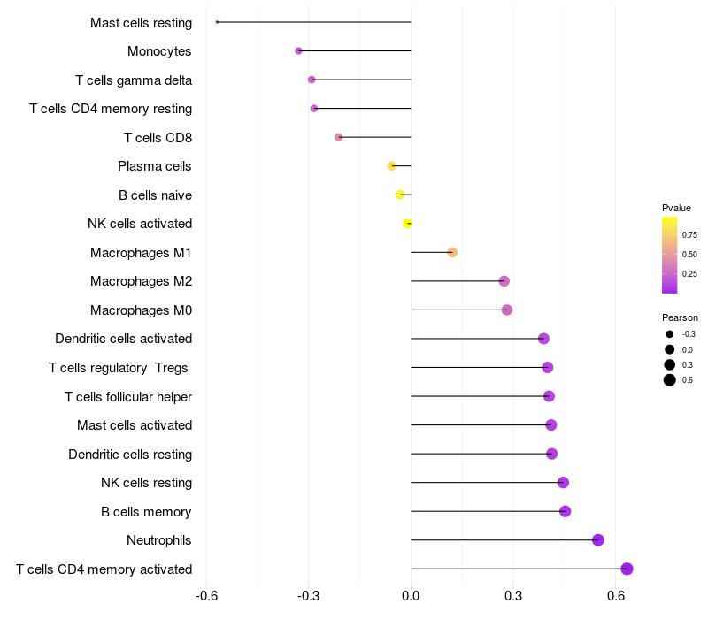 Lollipop of IER5 expression and immune infiltrating cell level correlation result in HPV+ samples
