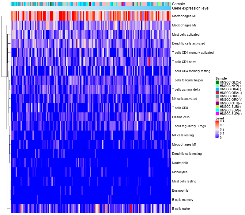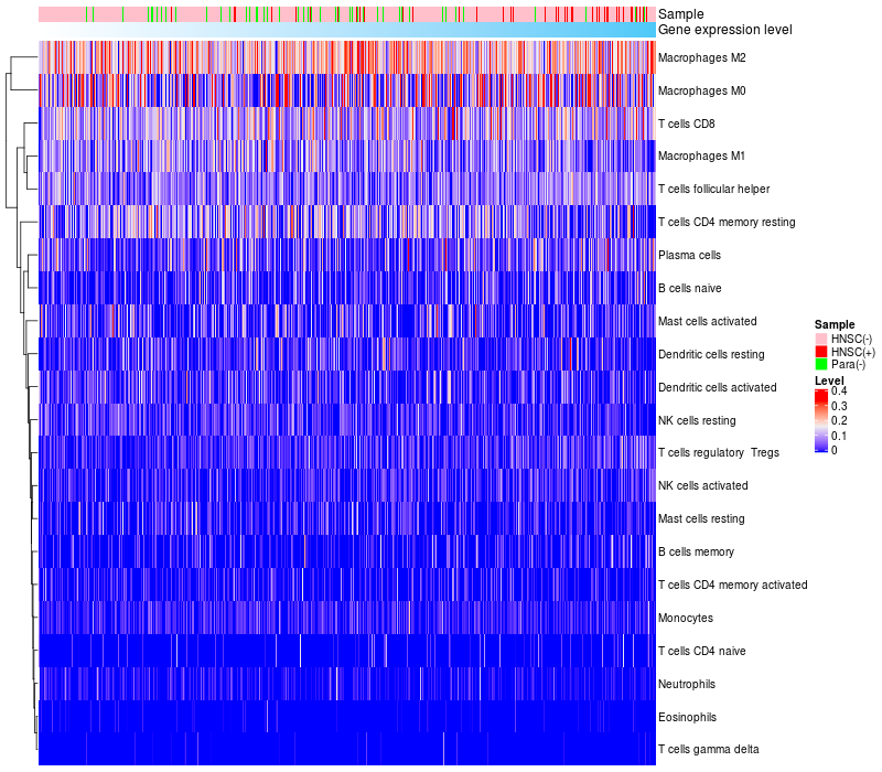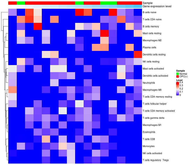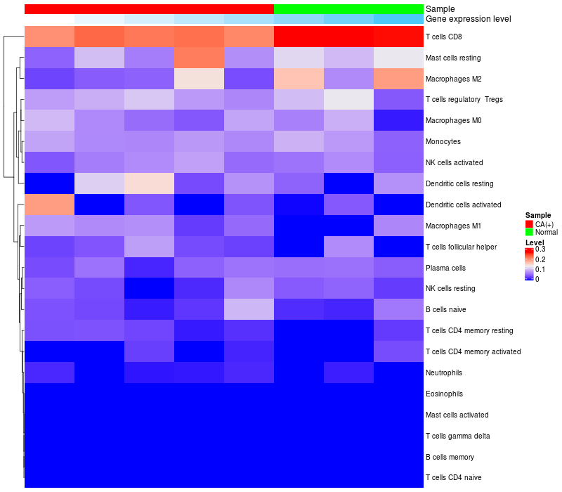 • Left: Heatmap of target gene expression and the level of various types of immune cells (cell type fractions) in all samples based on CIBERSORT method.