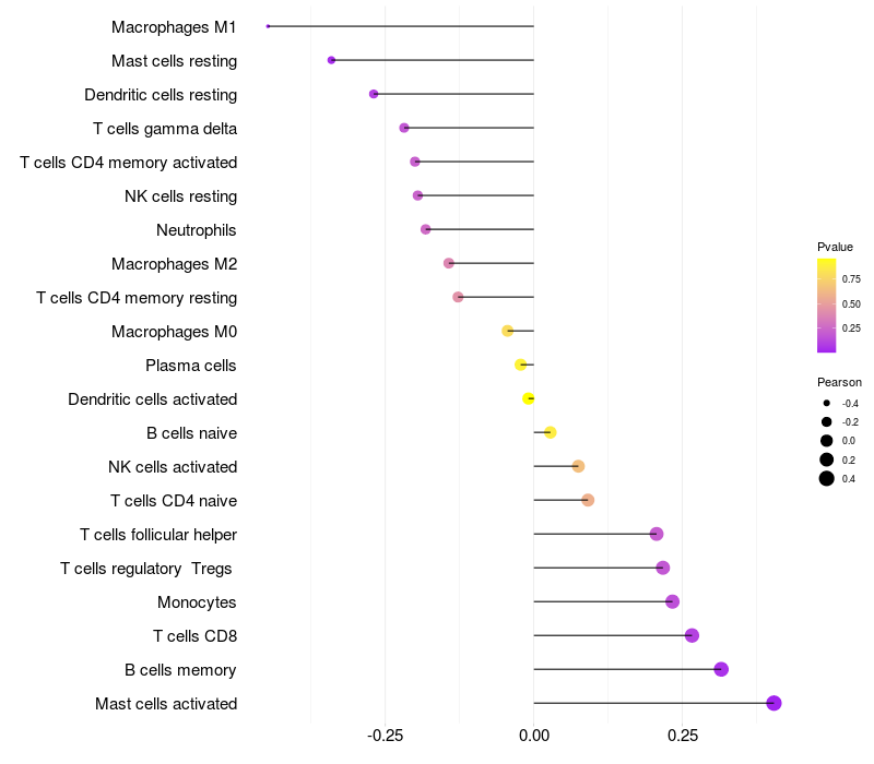 • Right: Correlation of target gene expression and the level of various types of immune cells in virus positive samples (Pearson Correlation Coefficient).