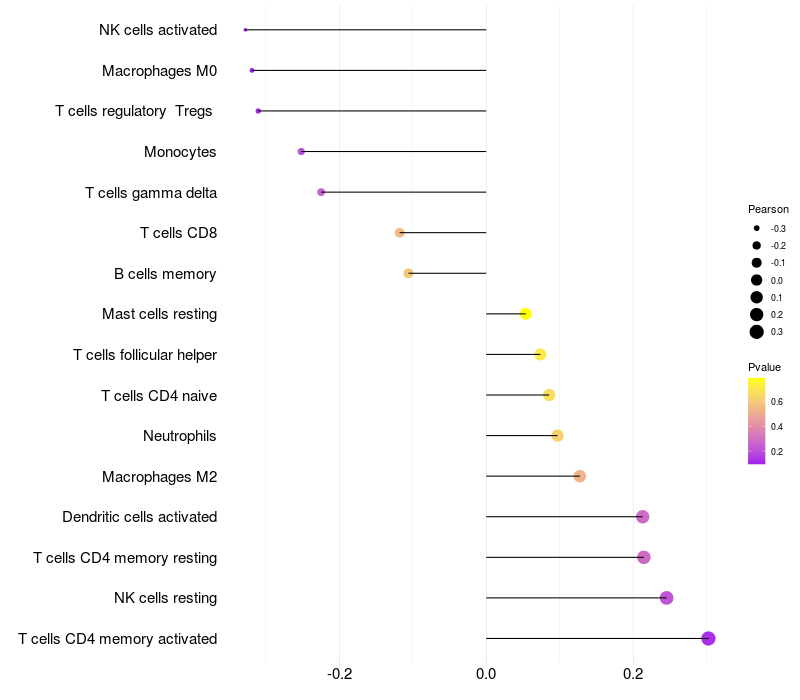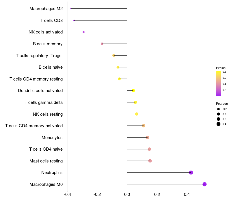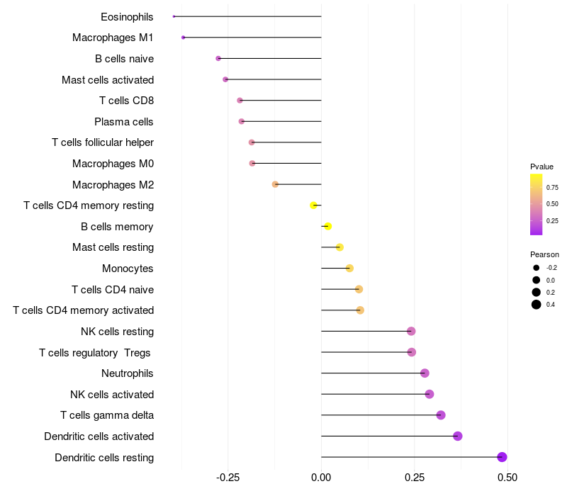 Lollipop of IGF2BP3 expression and immune infiltrating cell level correlation result in HTLV1+ samples