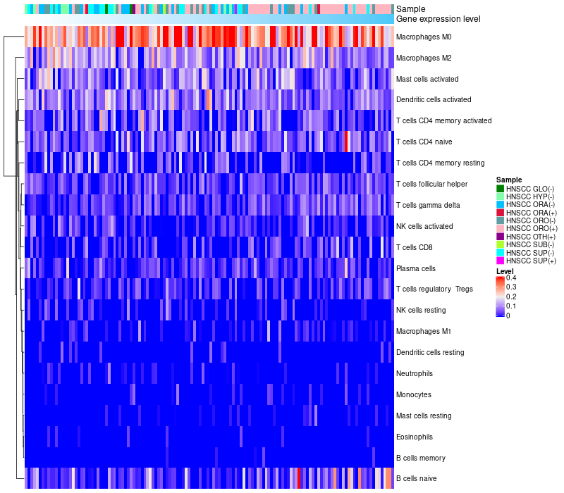 • Left: Heatmap of target gene expression and the level of various types of immune cells (cell type fractions) in all samples based on CIBERSORT method.