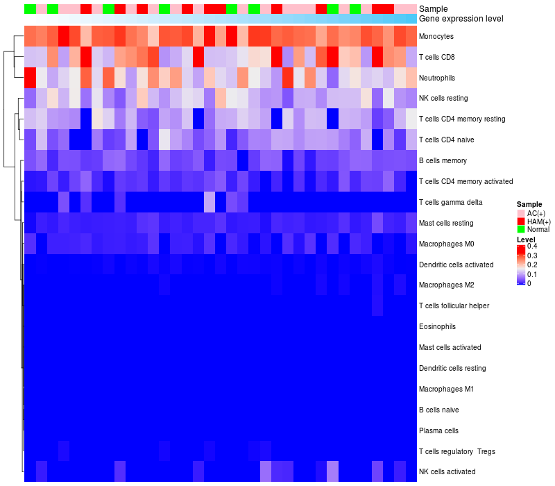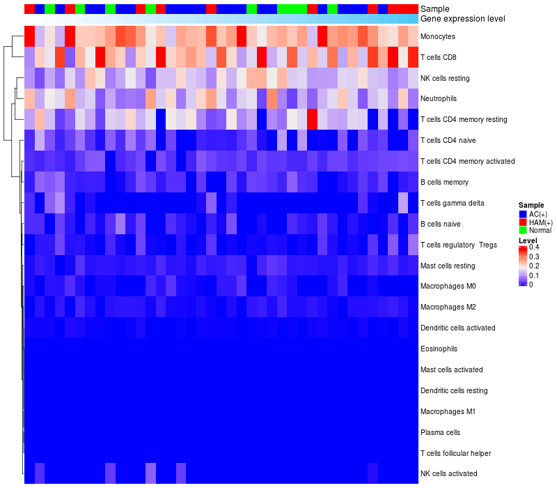 Normal (8), Asymptomatic carriers (HTLV1+)(17), HTLV-1-associated myelopathy (HTLV1+)(10) |