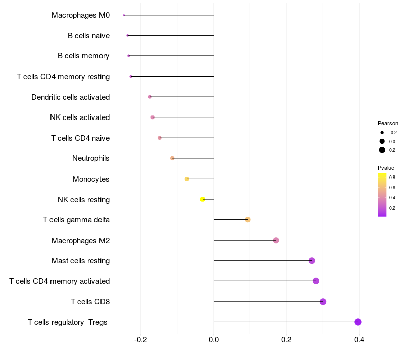 Lollipop of IL5RA expression and immune infiltrating cell level correlation result in HTLV1+ samples
